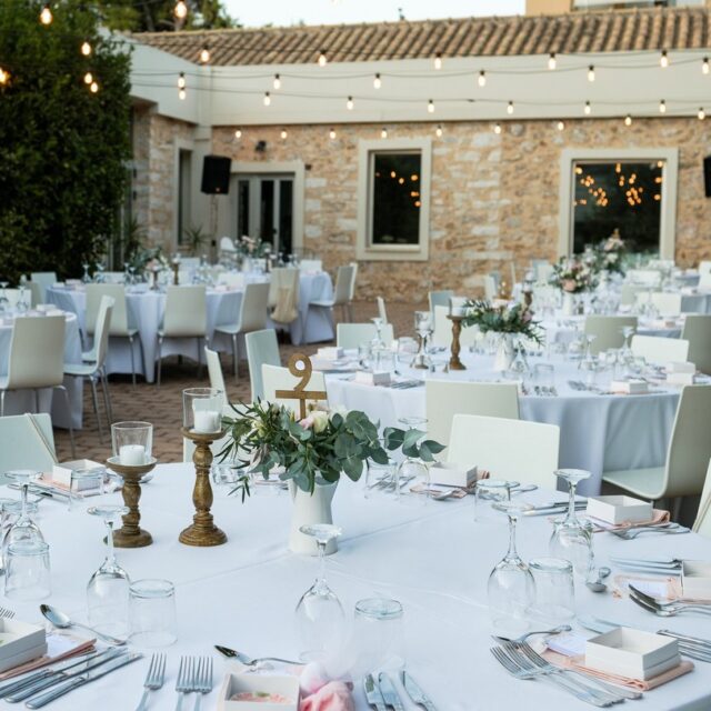 Η γραφική, πλακόστρωτη αυλή του venue προσφέρει άπειρες δυνατότητες styling που προσαρμόζονται σε κάθε baptism ή wedding concept.