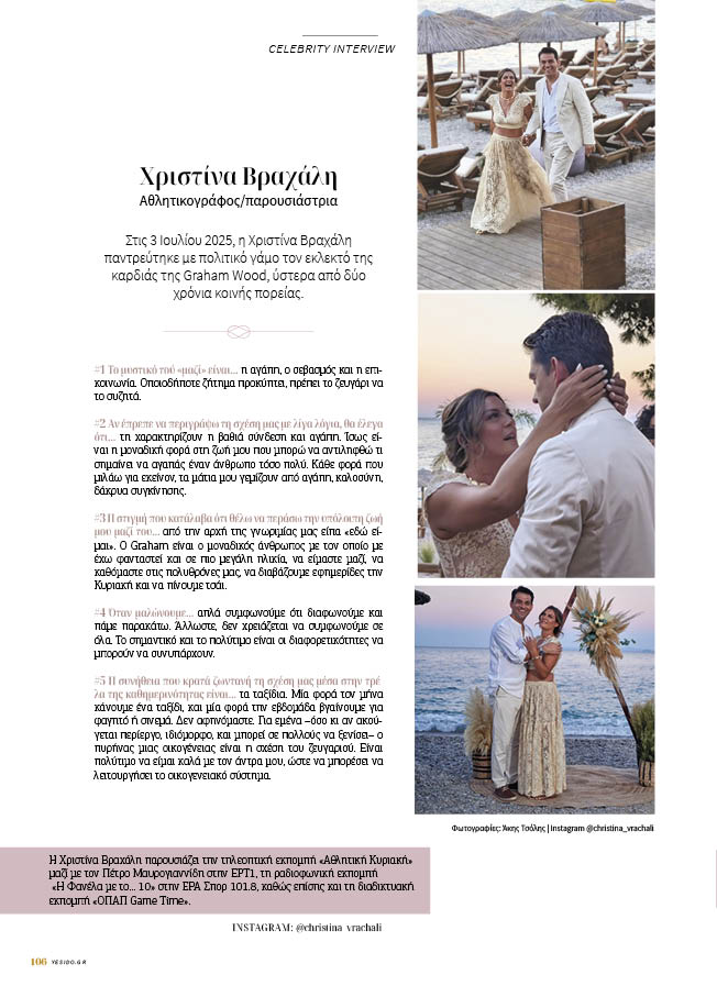 Στις 3 Ιουλίου 2025, η Χριστίνα Βραχάλη παντρεύτηκε με πολιτικό γάμο τον εκλεκτό της καρδιάς της Graham Wood, ύστερα από δύο χρόνια κοινής πορείας. Στο Yes I Do μιλά για τα μυστικά μιας ευτυχισμένης σχέσης που αντέχει στον χρόνο και εμείς… κρατάμε σημειώσεις!