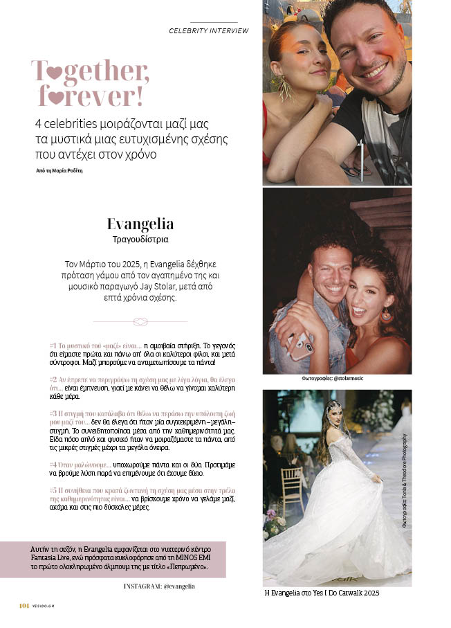 Τον Μάρτιο του 2025, η Evangelia δέχθηκε πρόταση γάμου από τον αγαπημένο της και μουσικό παραγωγό Jay Stolar, μετά από 7 χρόνια κοινής πορείας. Στο Yes I Do μιλά για τα μυστικά μιας ευτυχισμένης σχέσης που αντέχει στον χρόνο και εμείς… κρατάμε σημειώσεις!