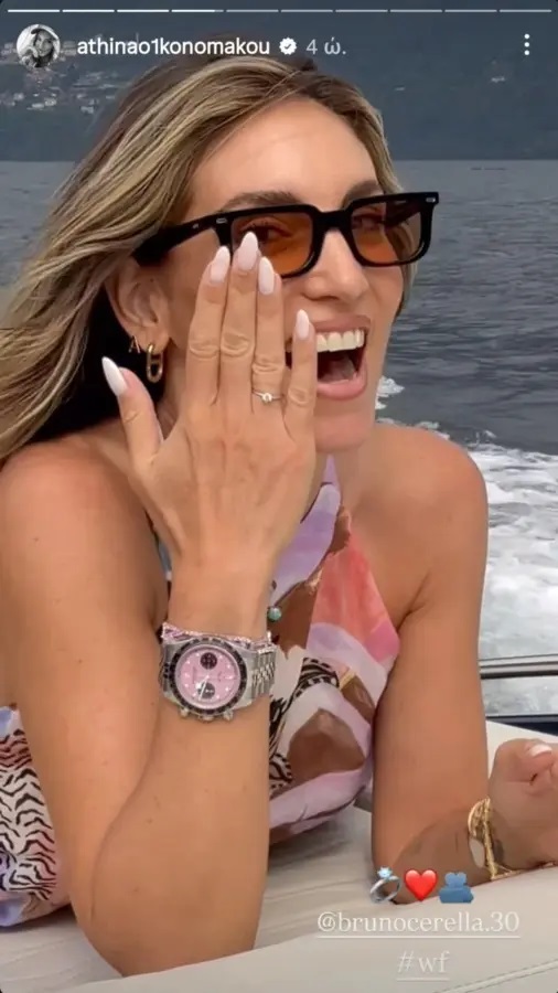 Τον περασμένο Ιούνιο η Αθηνά Οικονομάκου είχε δημοσιεύσει μια σειρά από stories στον προσωπικό της λογαριασμό στο Instagram, δείχνοντας στους followers της στιγμιότυπα από τη βόλτα τους με σκάφος στη λίμνη Κόμο, μεταξύ των οποίων και ένα βίντεο με το μονόπετρό της, επιβεβαιώνοντας με αυτόν τον τρόπο την πρόταση γάμου του αγαπημένου της.