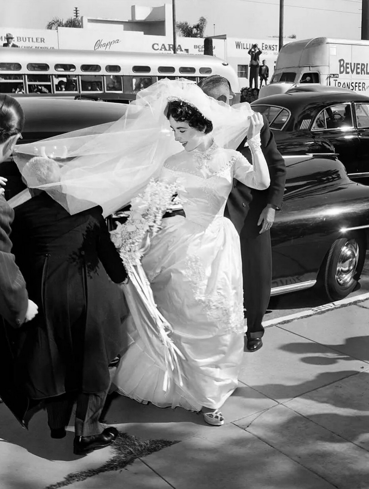 Παρά το γεγονός ότι παντρεύτηκε 8 φορές, το πρώτο νυφικό της Elizabeth Taylor ήταν το πιο luxury και showstopping. Το πλέον διάσημο σατέν φόρεμά της, από τον γάμο της με τον Conrad “Nicky” Hilton το 1950, σχεδιάστηκε από τη Helen Rose και περιλάμβανε μακριά μανίκια, φούστα σε A line και embellishments με πέρλες. Πουλήθηκε για 187.931 δολάρια σε δημοπρασία στο Λονδίνο το 2013, ποσό που σήμερα αντιστοιχεί σε 264.396.