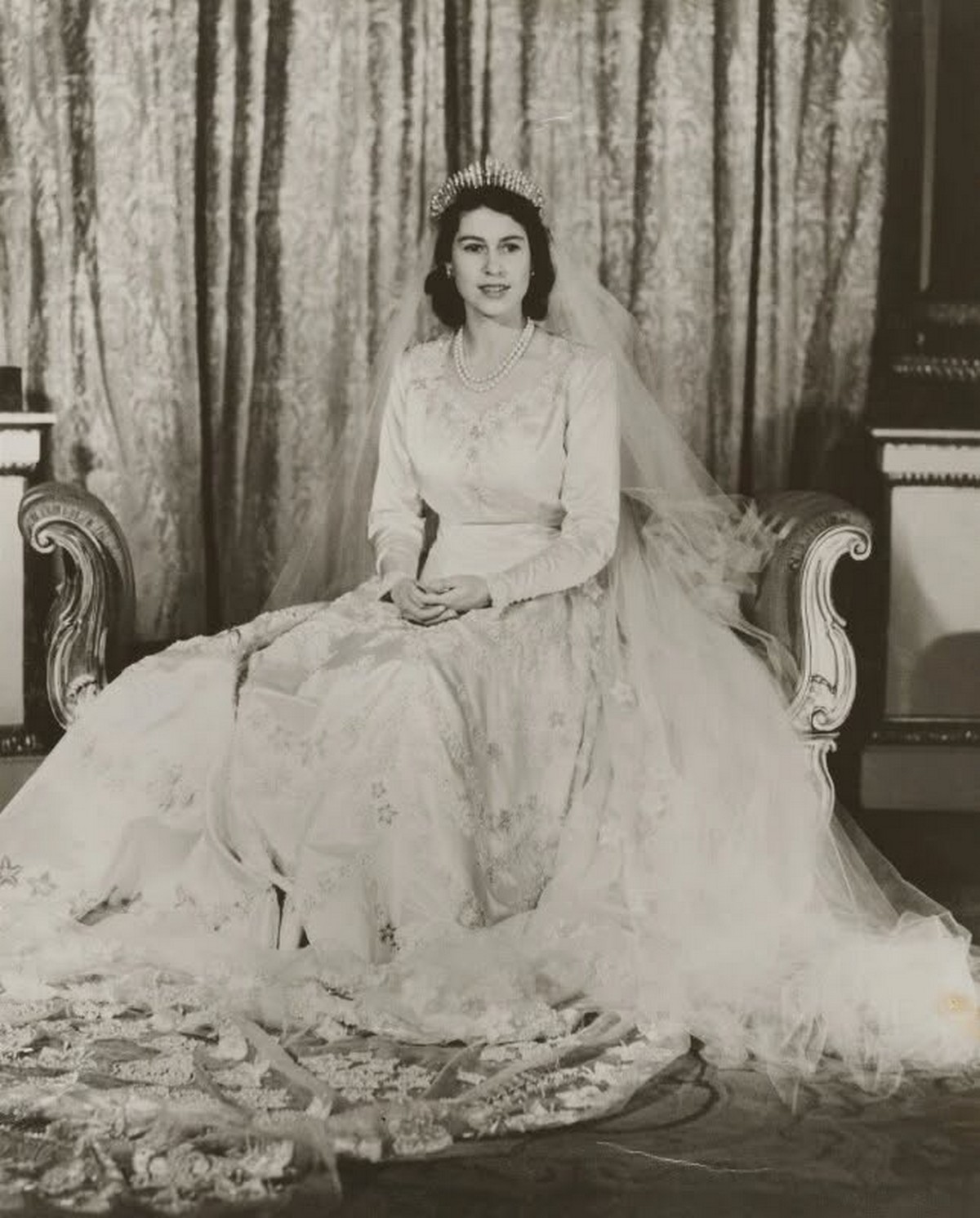 Στον γάμο της με τον πρίγκιπα Φίλιππο, η βασίλισσα Ελισάβετ φόρεσε νυφικό από σατέν Duchesse με μακριά μανίκια, κεντημένα λουλούδια και απλικέ από κρύσταλλα και μαργαριτάρια. Ο Norman Hartnell, ο σχεδιαστής πίσω από το bridal dress, λέγεται ότι εμπνεύστηκε από τον πίνακα «Primavera» του Botticelli για τη δημιουργία του. Η βασίλισσα Ελισάβετ πλήρωσε 42.000 δολάρια για το βασιλικό της σύνολο το 1947, ποσό που αντιστοιχεί σε περίπου 1,6 εκατομμύρια δολάρια σήμερα.