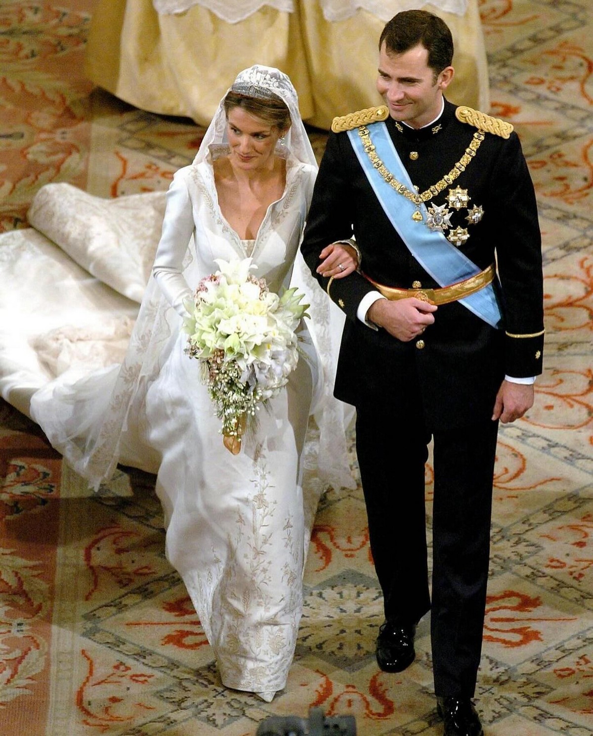 Η βασίλισσα Letizia παντρεύτηκε τον βασιλιά Felipe ΣΤ’ της Ισπανίας στις 2 Μαΐου 2004 με μεγαλοπρεπές νυφικό που έφερε την υπογραφή του Manuel Pertegaz. Το φόρεμα είχε μακριά μανίκια, ψηλό γιακά με V-neck και 4.6 μέτρα ουρά. Για extra δόσεις πολυτέλειας, ο σχεδιαστής πρόσθεσε πραγματικό χρυσό στο κέντημα. Εκείνη την εποχή, το bridal outfit κόστισε 8 εκατομμύρια δολάρια, σήμερα η τιμή του θα ανερχόταν περίπου στα 13.7 εκατομμύρια δολάρια.