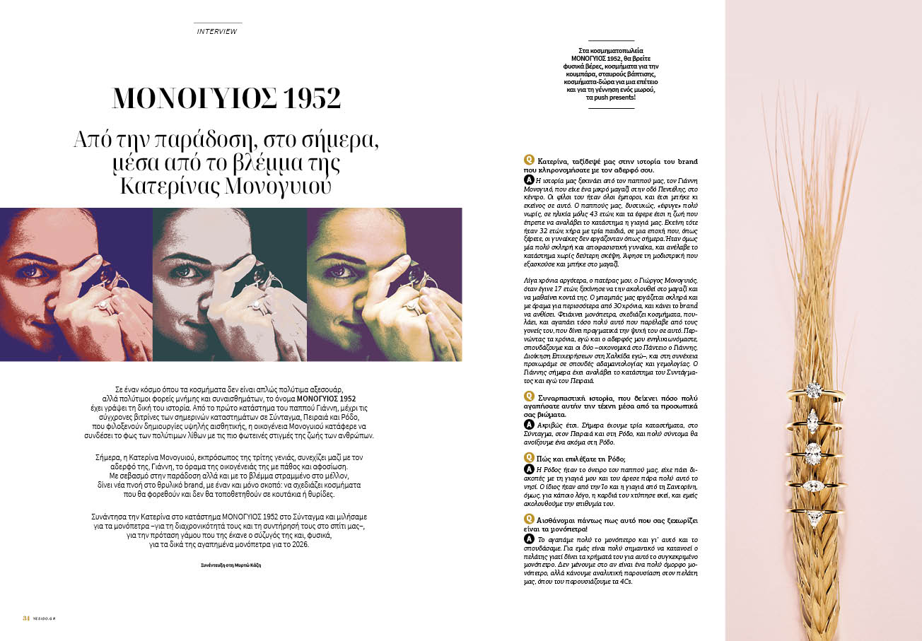 Συνάντησα την Κατερίνα στο κατάστημα ΜΟΝΟΓΥΙΟΣ 1952 στο Σύνταγμα και μιλήσαμε για τα μονόπετρα -για τη διαχρονικότητά τους και τη συντήρησή τους στο σπίτι μας-, για την πρόταση γάμου που της έκανε ο σύζυγός της και, φυσικά, για τα δικά της αγαπημένα μονόπετρα για το 2026.