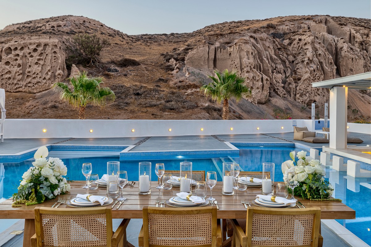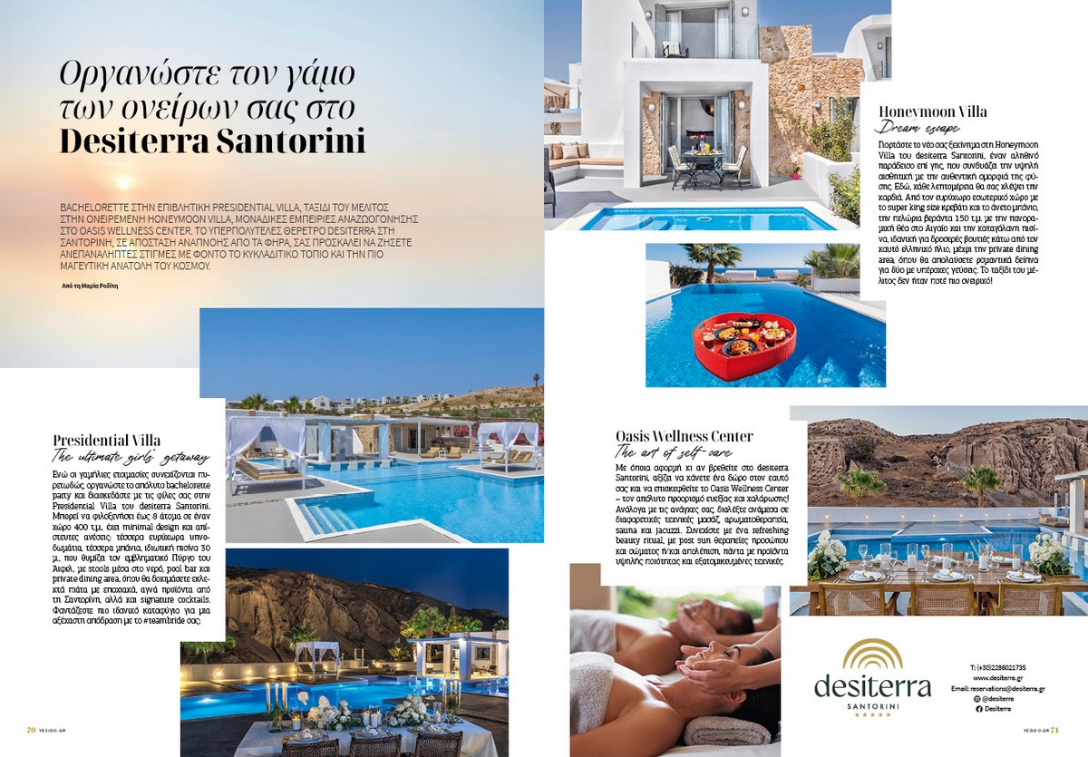 Bachelorette στην επιβλητική Presidential Villa, ταξίδι του μέλιτος στην ονειρεμένη Honeymoon Villa, μοναδικές εμπειρίες αναζωογόνησης στο Oasis Wellness Center. Το υπερπολυτελές θέρετρο desiterra στη Σαντορίνη, σε απόσταση αναπνοής από τα Φηρά, σας προσκαλεί να ζήσετε ανεπανάληπτες στιγμές με φόντο το κυκλαδίτικο τοπίο και την πιο μαγευτική ανατολή του κόσμου.