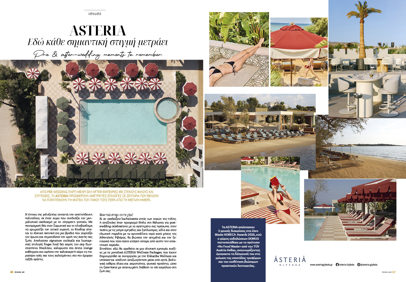 Yes I Do Note: Τα ASTERIA απέσπασαν 3 χρυσές διακρίσεις στα Zero Waste HORECA Awards 2026, ενώ ο χώρος εκδηλώσεων DOMUS πιστοποιήθηκε με το πρότυπο «No Food Waste» από την TÜV Austria Hellas, αναγνωρίζοντας έμπρακτα τη δέσμευσή του στη μείωση της σπατάλης τροφίμων και την υιοθέτηση βιώσιμων πρακτικών λειτουργίας.