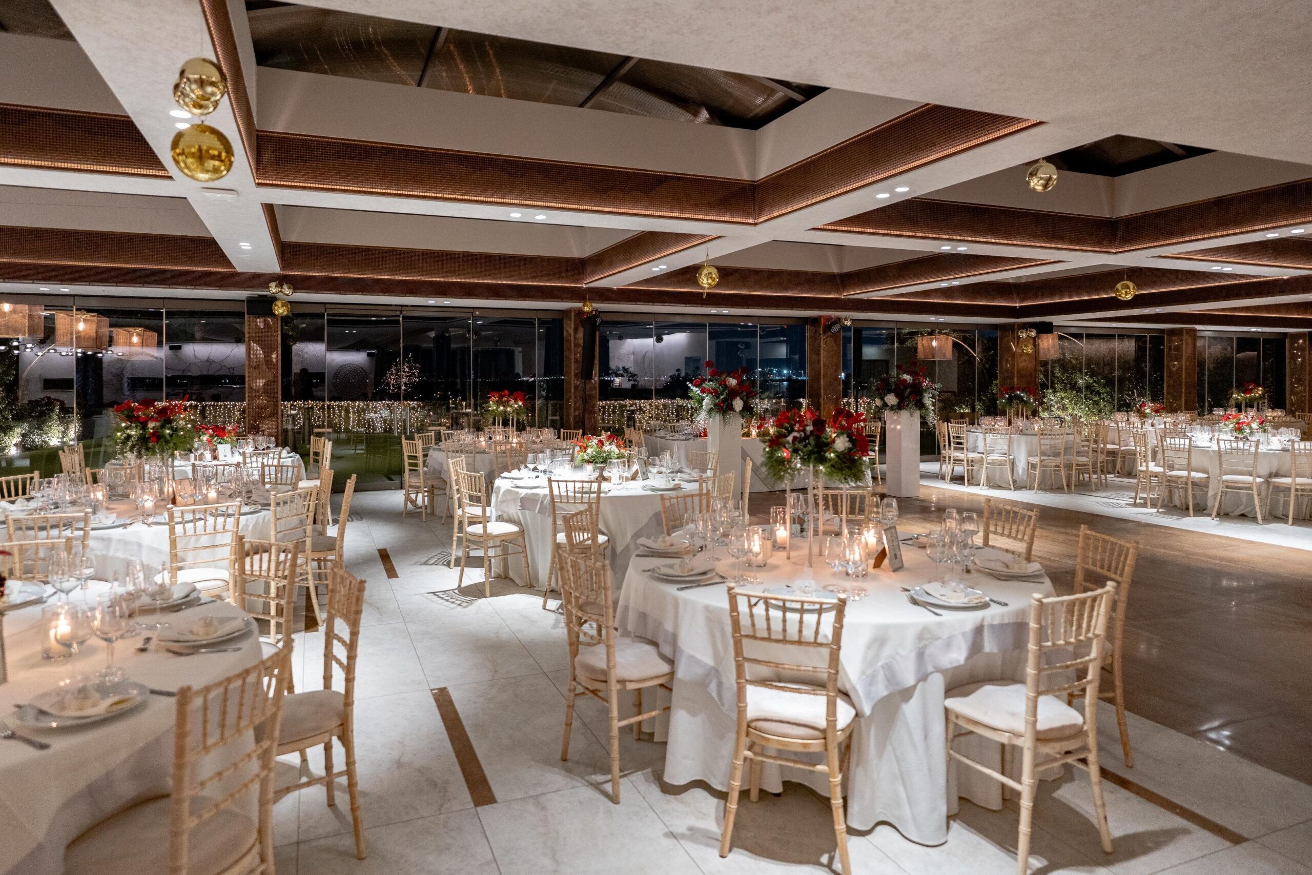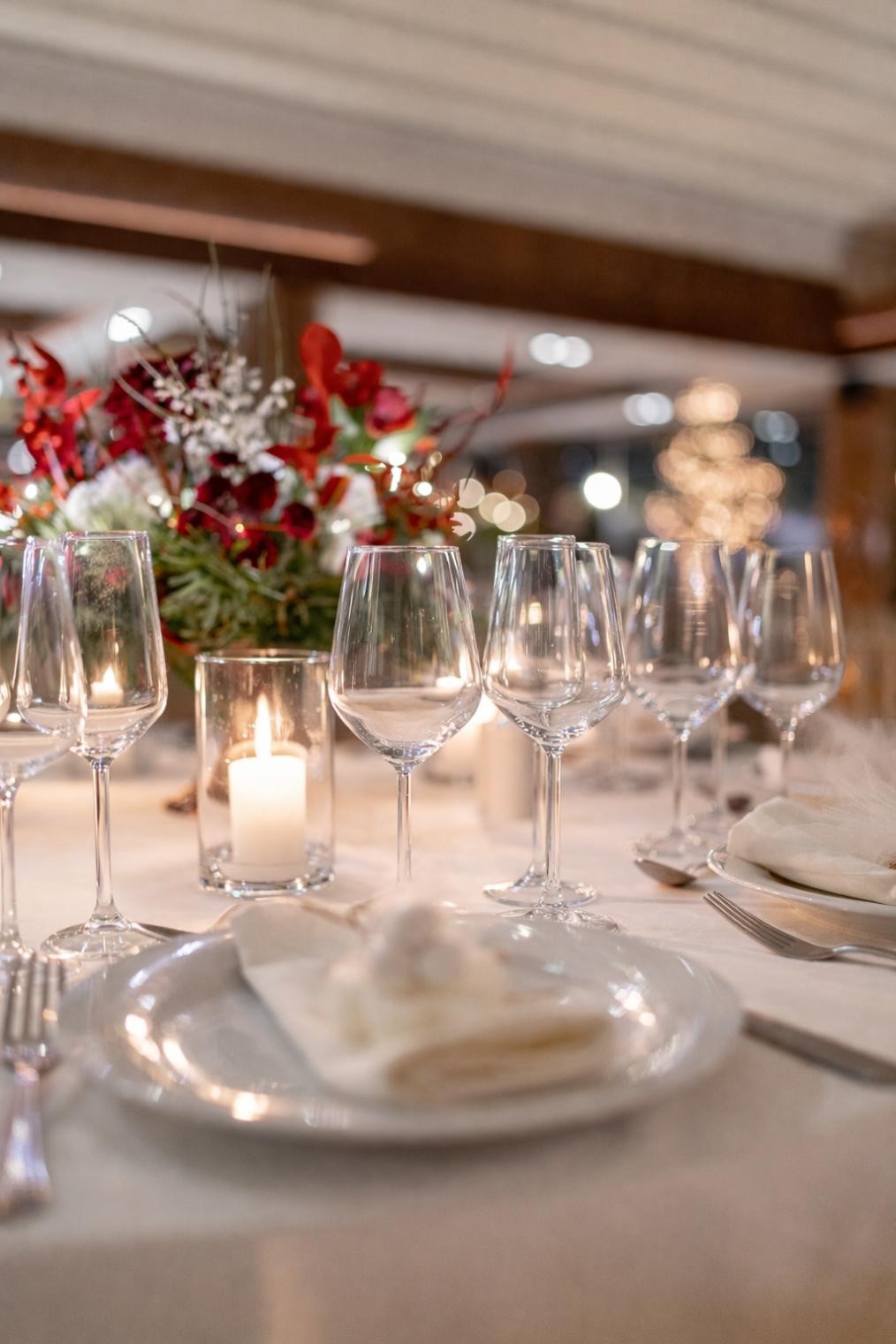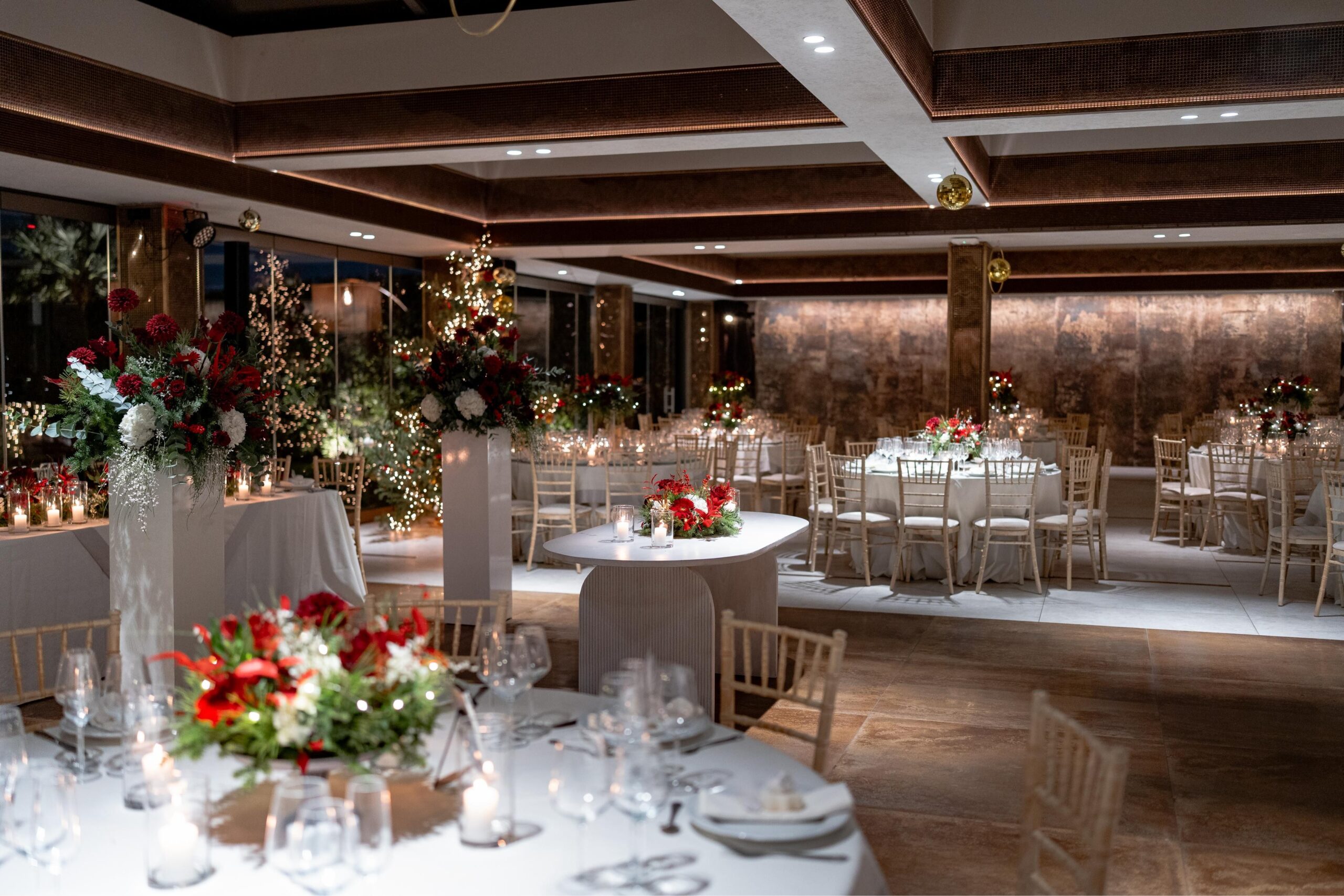 Η διακόσμηση ακολούθησε τη φιλοσοφία του less is more. Λευκά και κόκκινα άνθη με πράσινες πινελιές και φυσικά υλικά δημιούργησαν ένα refined winter setting, αφήνοντας τον χώρο του Ble Pavillon να αναδειχθεί χωρίς υπερβολές. Οι υφές που αντανακλούσαν το γλυκό φως και οι διακριτικές λάμψεις χάρισαν μια συνολική αισθητική που δεν «φωνάζει», αλλά ξεχωρίζει.