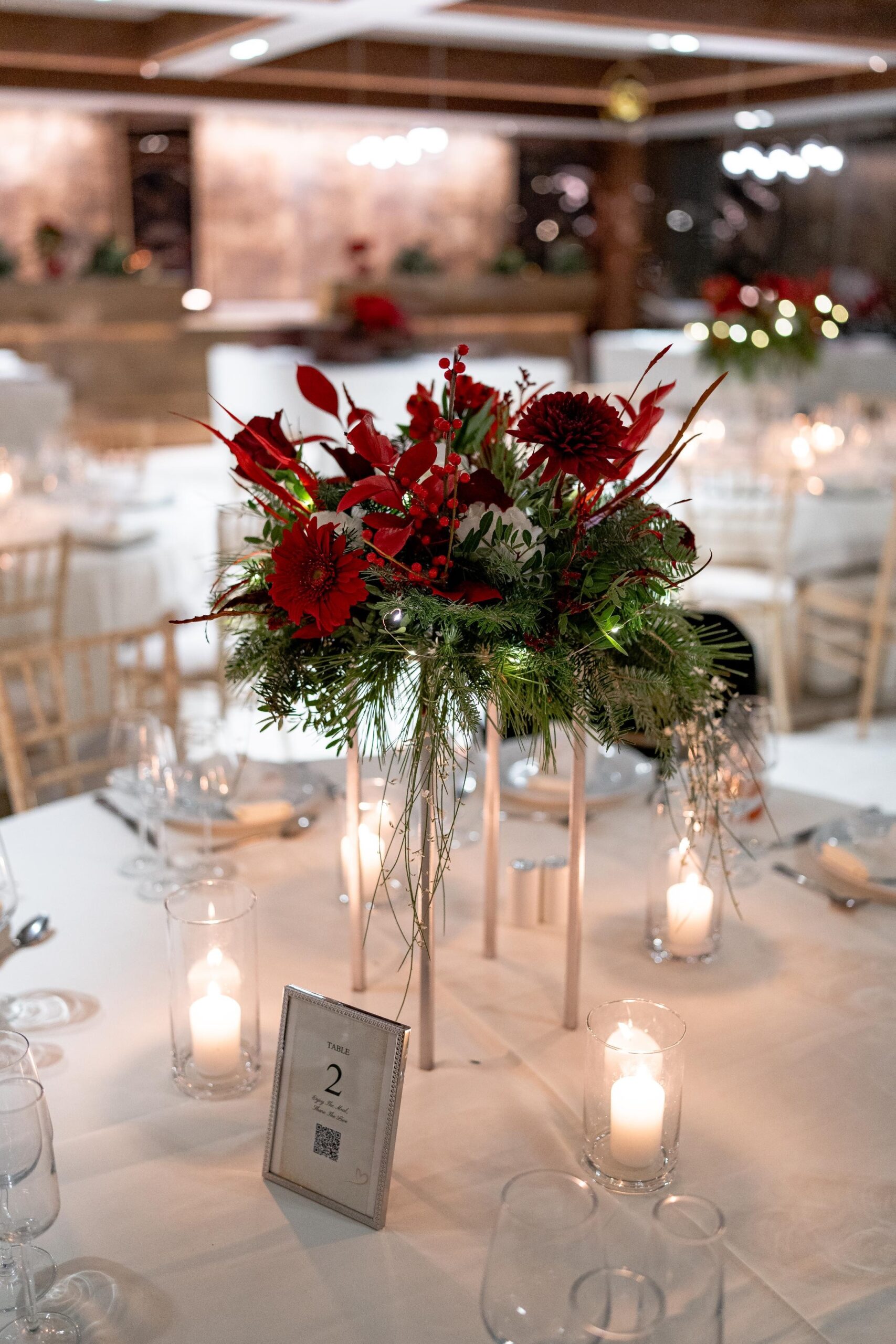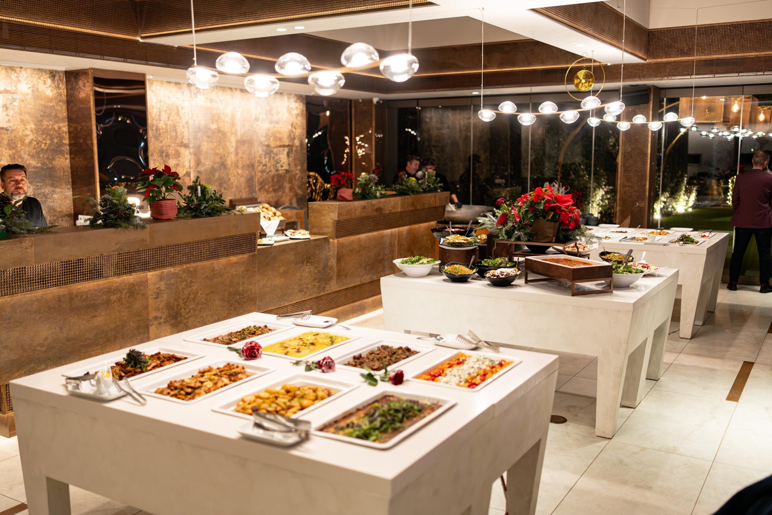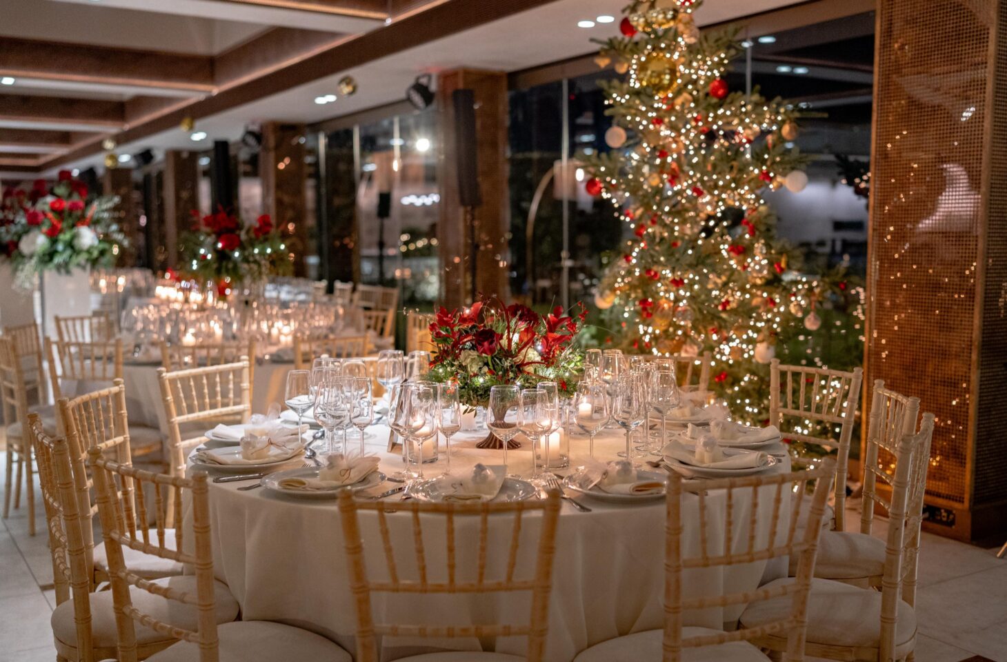 Η διακόσμηση ακολούθησε τη φιλοσοφία του less is more. Λευκά και κόκκινα άνθη με πράσινες πινελιές και φυσικά υλικά δημιούργησαν ένα refined winter setting, αφήνοντας τον χώρο του Ble Pavillon να αναδειχθεί χωρίς υπερβολές. Οι υφές που αντανακλούσαν το γλυκό φως και οι διακριτικές λάμψεις χάρισαν μια συνολική αισθητική που δεν «φωνάζει», αλλά ξεχωρίζει.