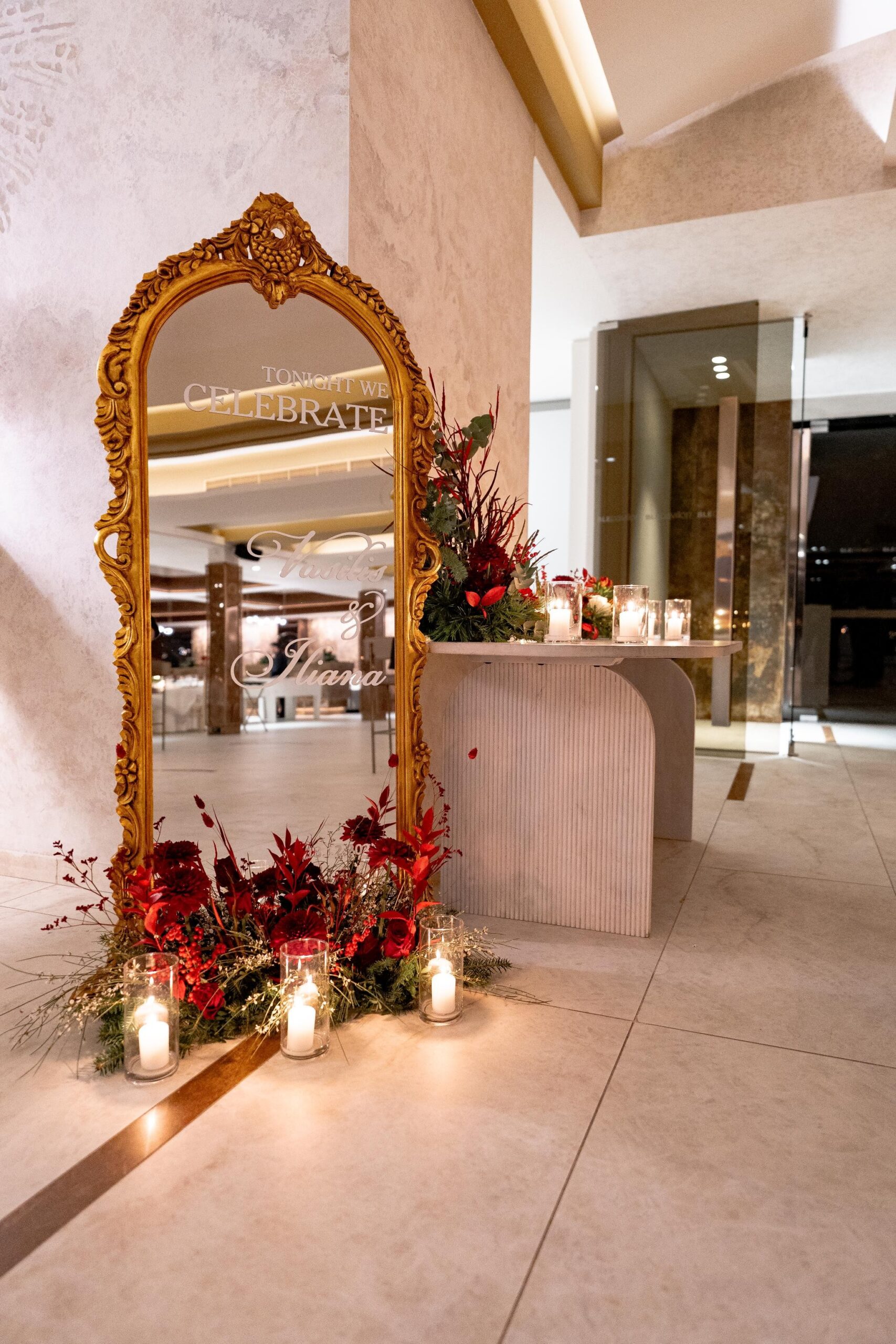 Κάθε στοιχείο της διακόσμησης συνδυαζόταν με έναν αέρα φινέτσας, δημιουργώντας μια ατμόσφαιρα ταυτόχρονα intimate και grand. Το χρυσό στα φωτιστικά, τα κεριά και όλες οι λεπτομέρειες πρόσθεσαν μια διακριτική λάμψη, προσφέροντας subtle glamour στο design.