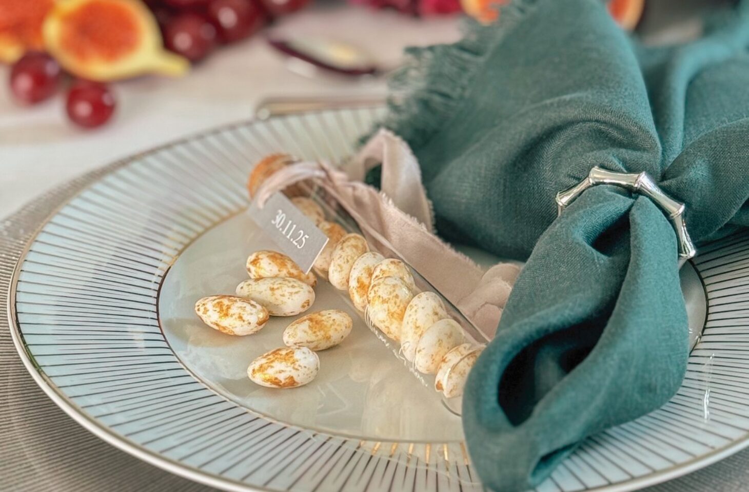 Η γιορτινή περίοδος χαρακτηρίζεται από λάμψη και γλυκές στιγμές, και τα κουφέτα σας είναι γεμάτα από αυτήν τη μαγεία! Επιλέξτε για τις μπομπονιέρες σας τα κουφέτα Αμυγδάλου Supreme, με ολόκληρο καβουρδισμένο αμύγδαλο και γλυκιά γεύση καραμέλας, για να μεταφέρετε τα εορταστικά vibes στους καλεσμένους σας! Οι χρυσές πιτσίλες τους χαρίζουν glam διάθεση, ιδανική για χριστουγεννιάτικους γάμους, οπότε προτιμήστε έναν γυάλινο σωλήνα για να την αναδείξετε.