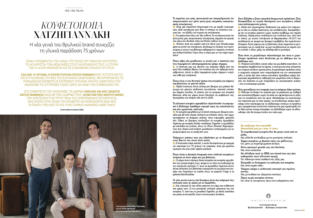 Στη συνέντευξη που ακολουθεί, τα αδέρφια Νικόλας και Αλέξανδρος Χατζηγιαννάκης μαζί με τον ξάδερφό τους, Κωνσταντίνο Μαυρογιάννη, που αποτελούν την τρίτη γενιά της οικογενειακής επιχείρησης, μας μυούν στην τέχνη του κουφέτου και μοιράζονται μαζί μας τα πάντα γύρω από το πιο γλυκό σημείο αναφοράς κάθε γάμου.