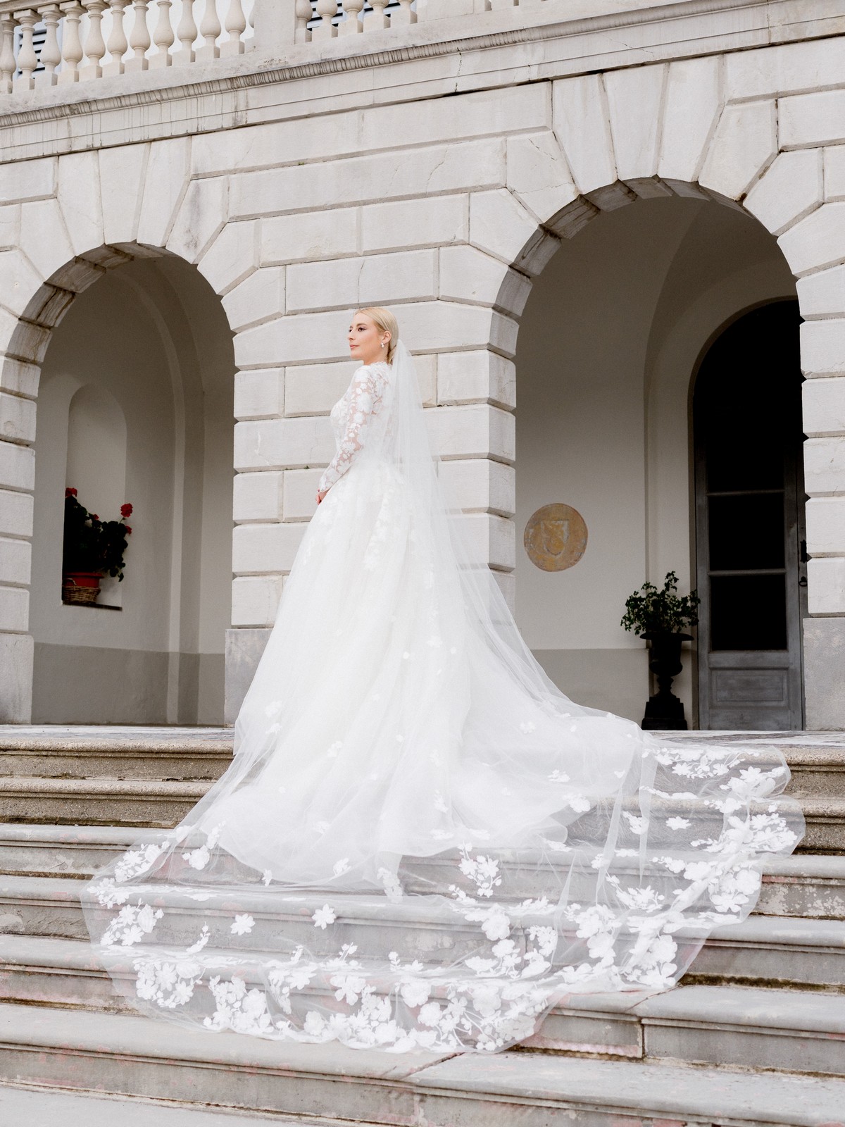 Η Calliope μοιάζει με σύγχρονη πριγκίπισσα που ζει το δικό της παραμύθι, μέσα στο royal style νυφικό Demetrios που αγκαλιάζει όμορφα τη σιλουέτα της, με φόντο ένα από τα πιο όμορφα τοπία της βόρειας Ιταλίας.