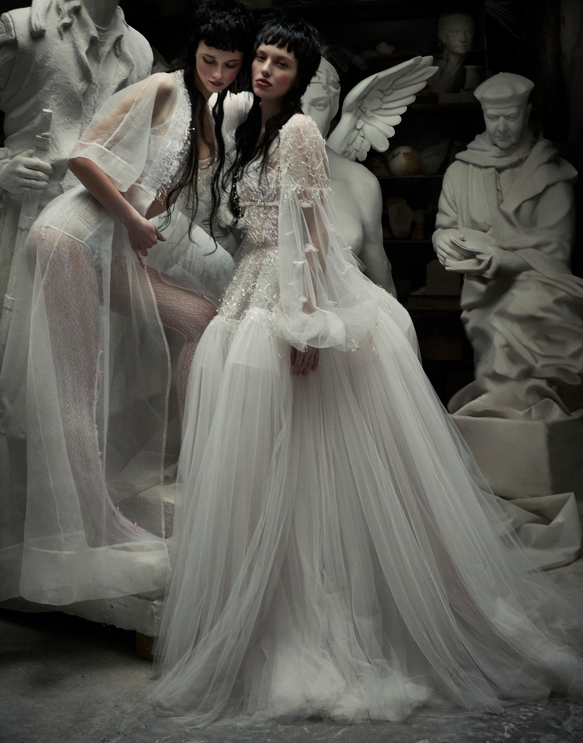 #3 Διάφανο lingerie και νυφικό σε φαρδιά γραμμή με puffy μανίκια, κατασκευασμένο από πλισέ κρεπ ύφασμα, σε συνδυασμό με ένα κομψό δαντελένιο φόρεμα που τονίζει την υφή του.