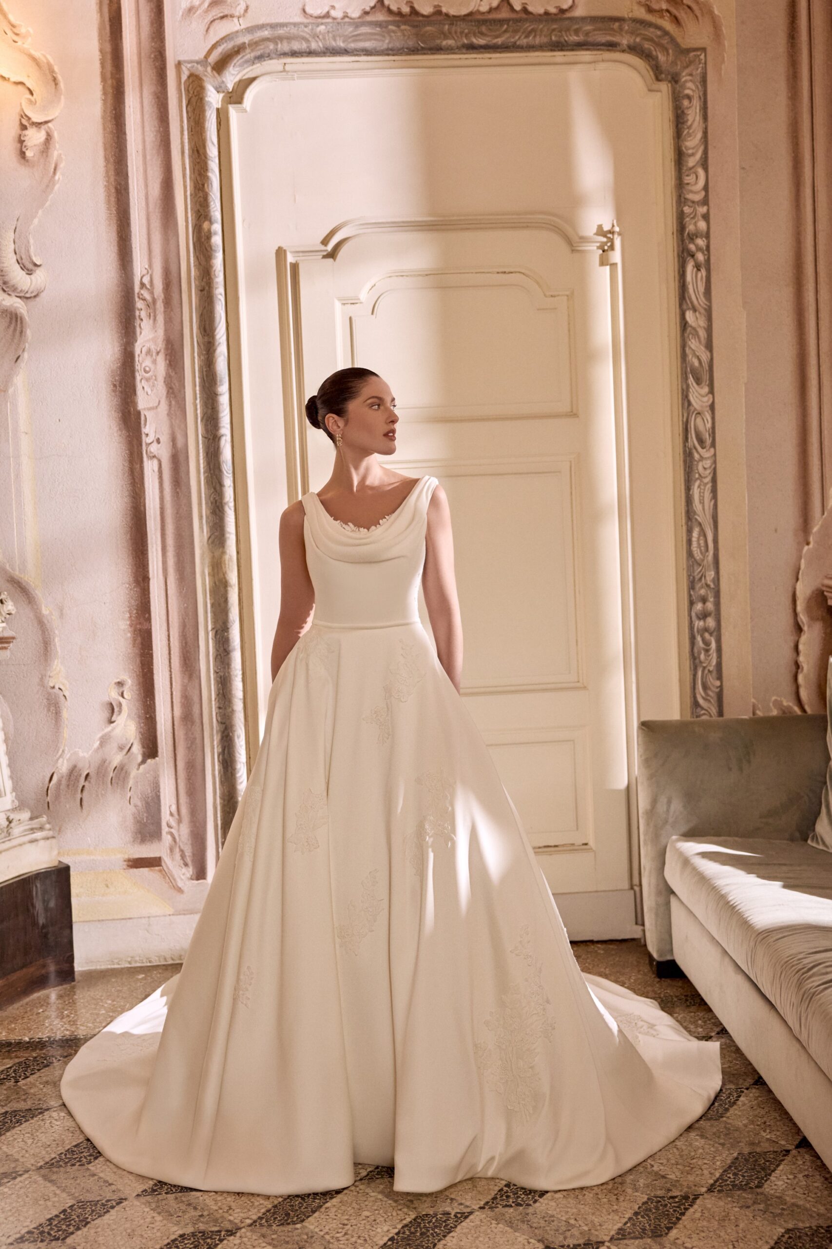 #1 Ball gown νυφικό από mikado με cowl λαιμόκοψη, illusion πλάτη σε σχήμα V και φούστα με floral κεντήματα που καταλήγει σε chapel ουρά.
