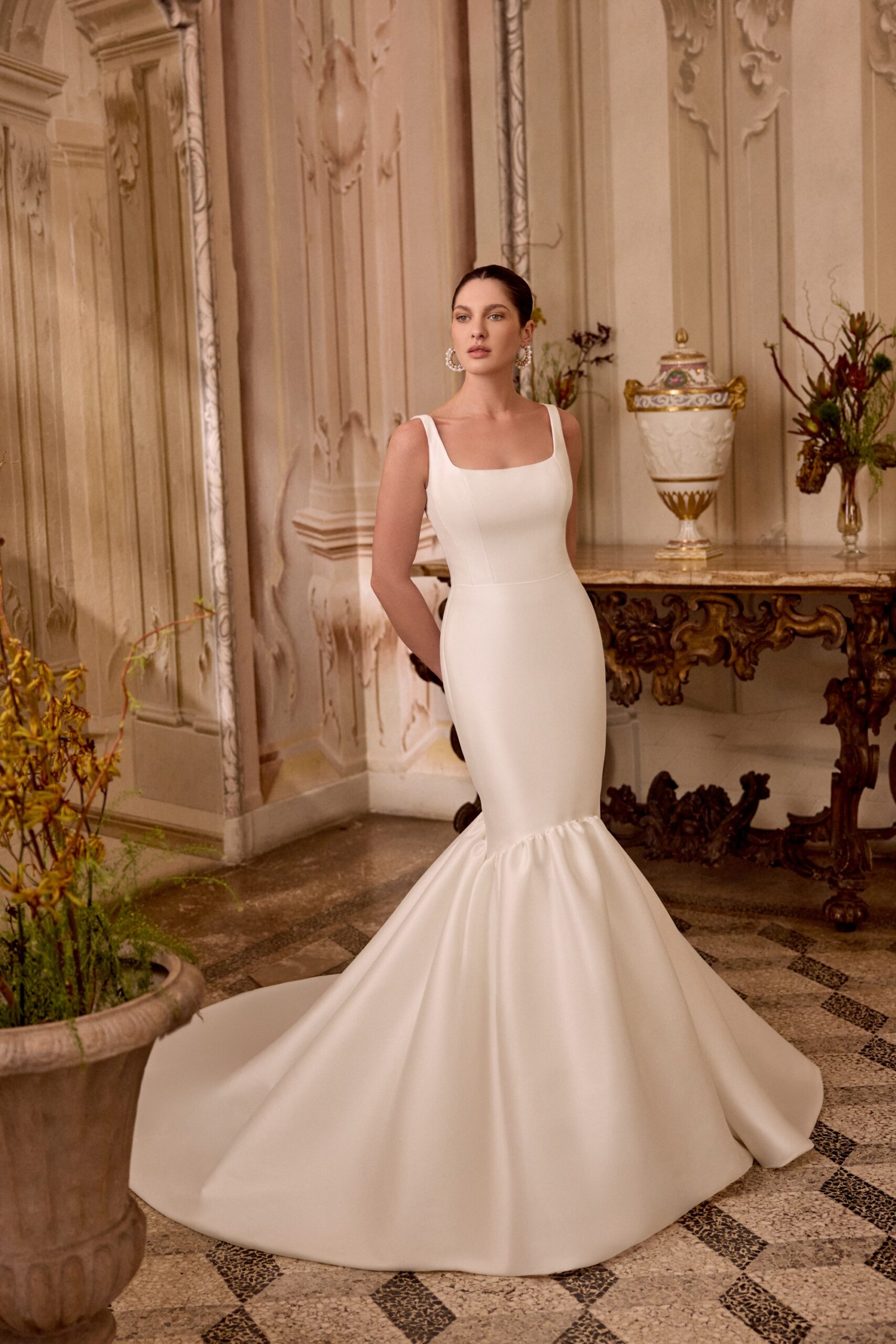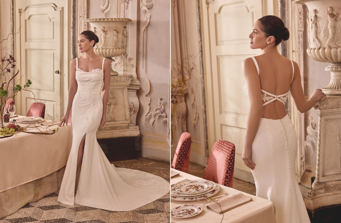 Στην bridal μόδα μεταφράζεται σε σιλουέτες που αγκαλιάζουν το σώμα με minimal τρόπο, όπως slip dresses, A-line νυφικά ή αυστηρά tailored σχέδια. Τα σατέν, mikado ή μεταξωτά κρεπ υφάσματα έχουν πρωταγωνιστικό ρόλο, ενώ οι λεπτομέρειες είναι διακριτικές: ένα ιδιαίτερο άνοιγμα στην πλάτη, ένα εκλεπτυσμένο neckline ή μια elegant ουρά.