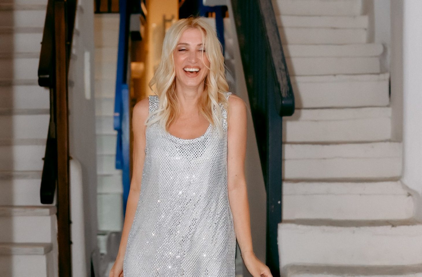 Πρόκειται για ένα boxy-fit φόρεμα σε loose γραμμή, με φαρδιές τιράντες και εκατοντάδες λαμπερά embellishments που θα μπορούσε να φορεθεί και ως party dress από τις brides-to-be. Δείτε πώς το συνδύασε η Μυρτώ και εμπνευστείτε για τα summer looks σας!