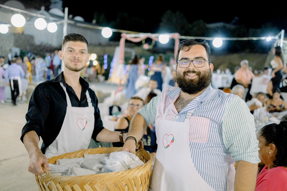 Στο νυφικό τραπέζι κάθισε το σόι του γαμπρού, ενώ οι άντρες από την οικογένεια της νύφης φόρεσαν ποδιές με τα αρχικά της και ανέλαβαν να σερβίρουν τον κόσμο, σχηματίζοντας μια μεγάλη σειρά για να εξυπηρετήσουν όλους τους καλεσμένους, αφού σερβιτόροι δεν υπήρχαν.