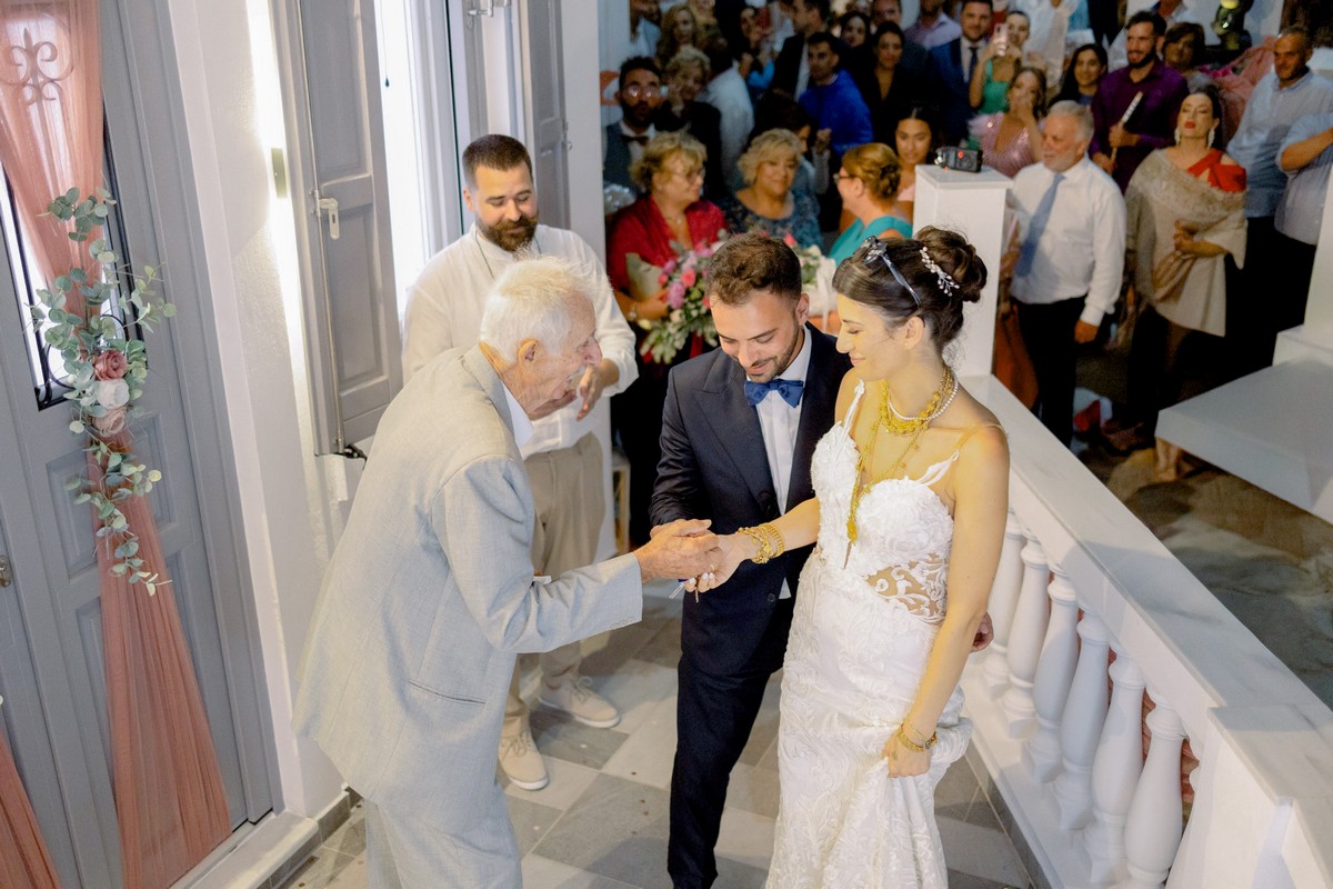 Έπειτα, ξεκίνησε η πομπή προς την εκκλησία: πρώτος ο γαμπρός με την οικογένειά του και από πίσω η νύφη με τη δική της, συνοδεία ορχήστρας. Αφού ολοκληρώθηκε το μυστήριο, ξεκίνησε το γλέντι – ένα γλέντι που ήταν ανοιχτό σε όλους, χωρίς κάλεσμα. Όλο το νησί έδωσε το παρών, ευχήθηκε στους νεόνυμφους και γιόρτασε μαζί τους, με εκλεκτές τοπικές γεύσεις, παραδοσιακά τραγούδια και πολύ χορό μέχρι τις πρώτες πρωινές ώρες.