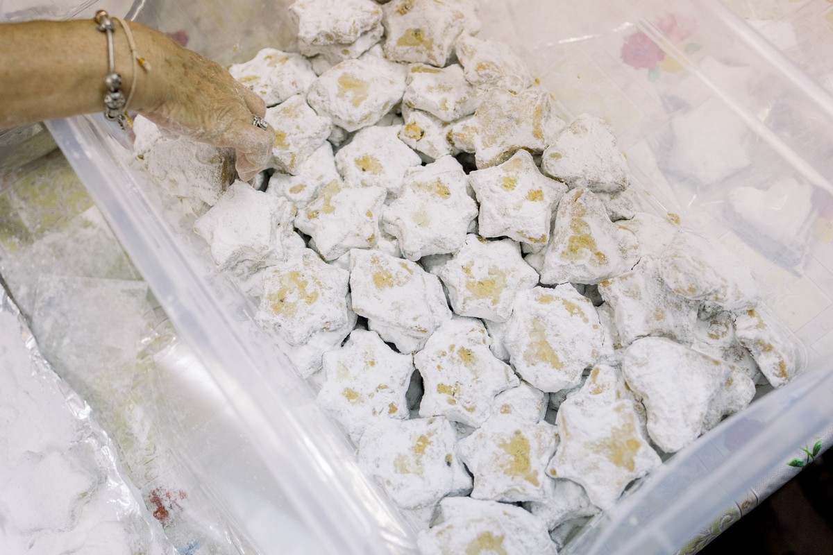 Η προετοιμασία, το ζύμωμα και το ψήσιμο των κουραμπιέδων από τις γυναίκες του χωριού που συγκεντρώθηκαν την επόμενη ημέρα του σιδερώματος στο πατρικό της νύφης.