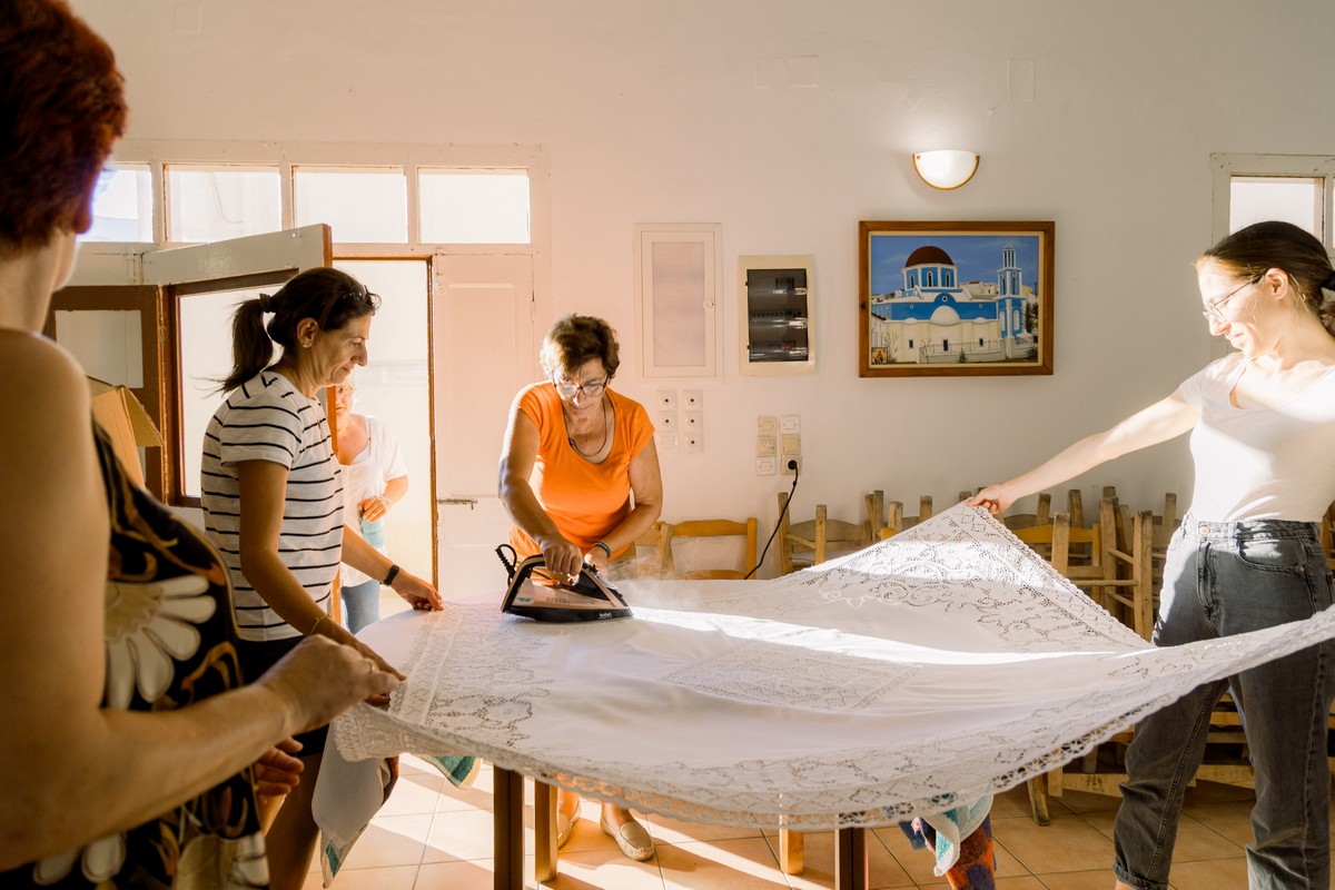 Οι θείες, που μαζεύτηκαν στο σπίτι της νύφης και, με προσοχή και αγάπη, σιδέρωσαν τα κεντήματα ετοιμάζοντας το προικιό.
