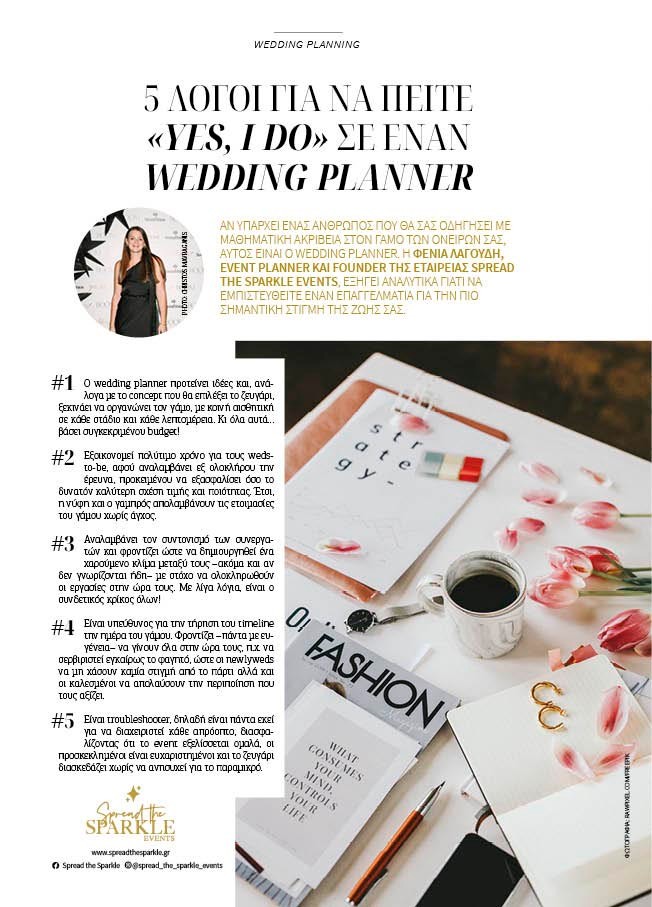 Αν υπάρχει ένας άνθρωπος που θα σας οδηγήσει με μαθηματική ακρίβεια στον γάμο των ονείρων σας, αυτός είναι ο wedding planner. Η Φένια Λαγούδη, event planner και founder της εταιρείας Spread The Sparkle Events, εξηγεί αναλυτικά γιατί να εμπιστευθείτε έναν επαγγελματία για την πιο σημαντική στιγμή της ζωής σας.