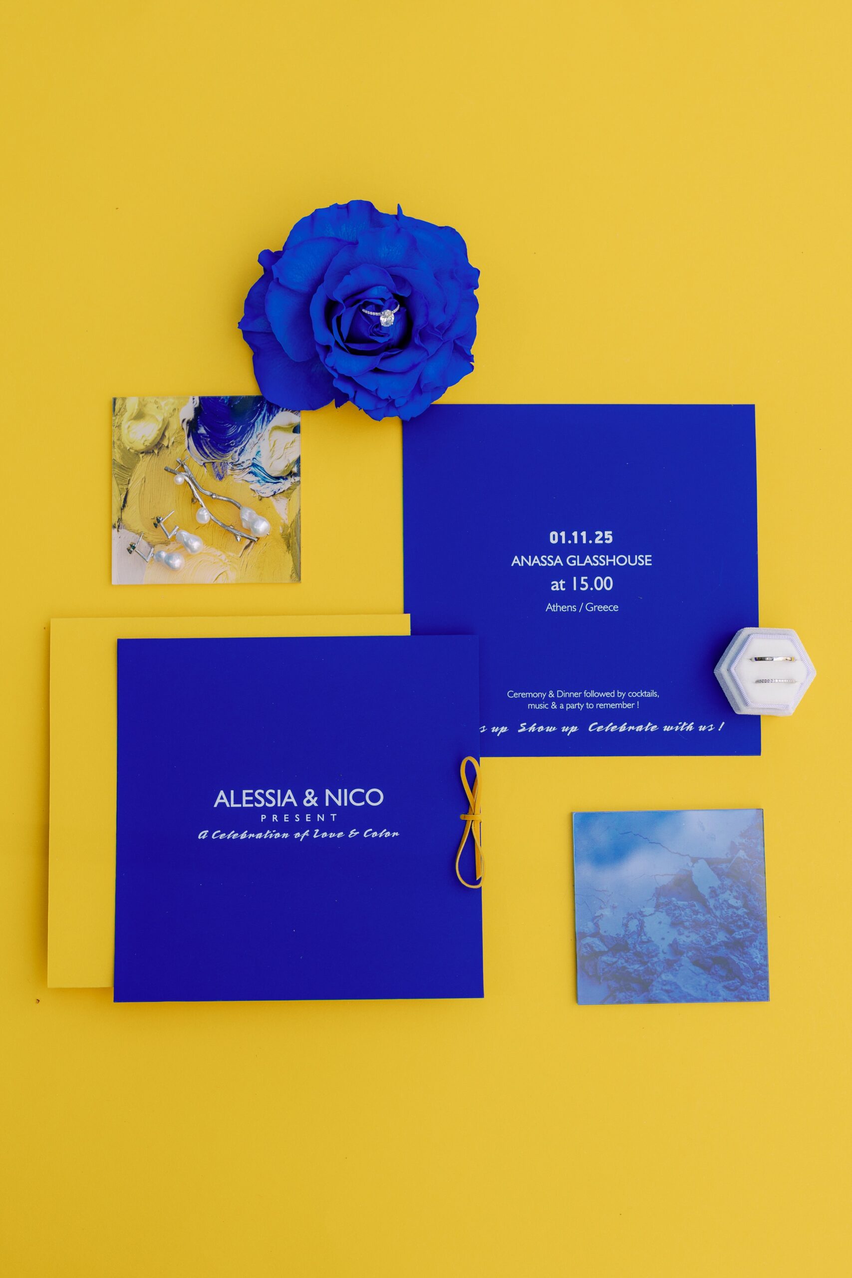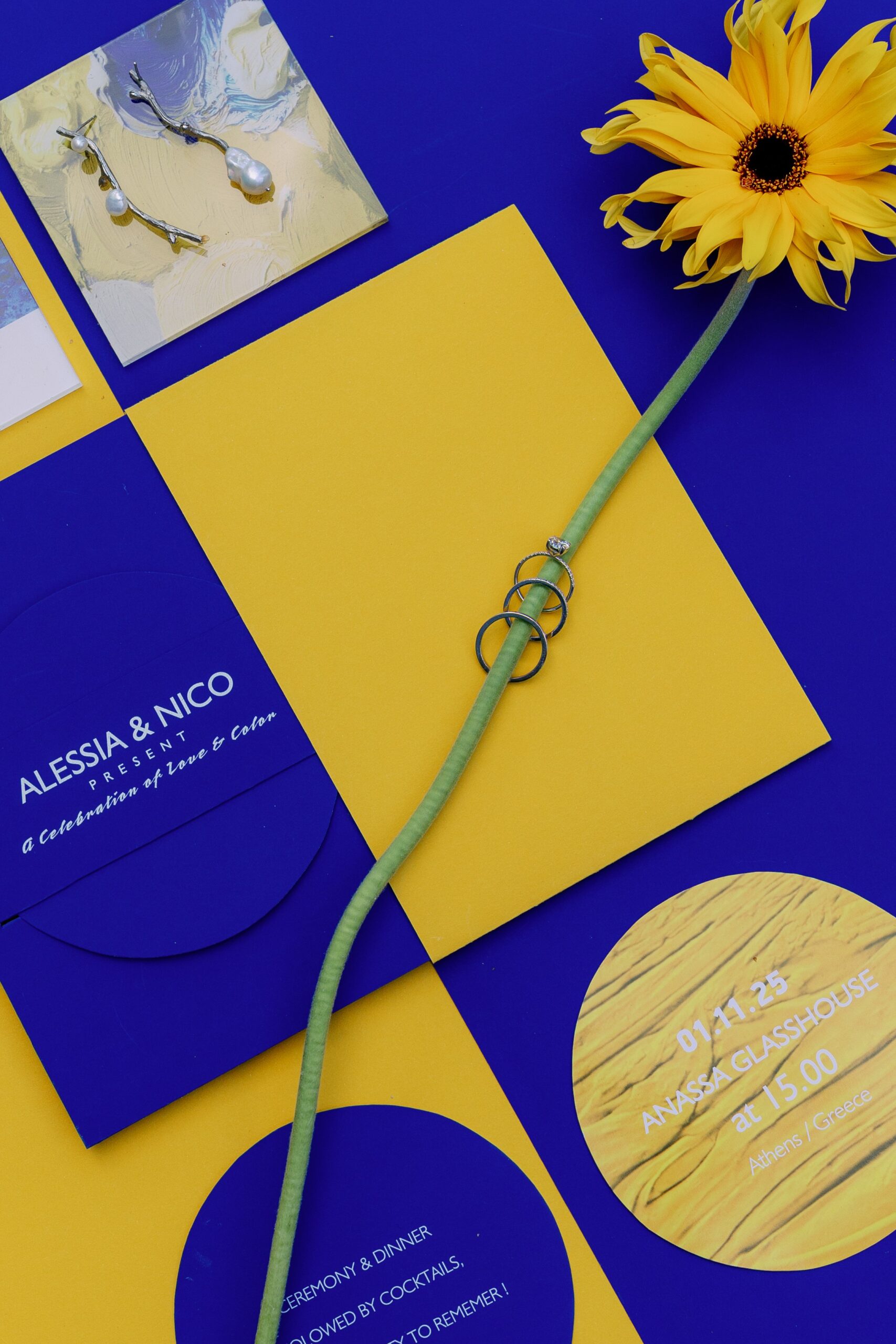 Το stationery ακολουθεί την ίδια φιλοσοφία: η χρήση απλών γραμμών και minimal τυπογραφίας επιτρέπει στα χρώματα να πρωταγωνιστήσουν χωρίς περισπασμούς, προϊδεάζοντας τους καλεσμένους για το ύφος του γάμου. Κυκλικά μοτίβα συνυπάρχουν με αυστηρές επιφάνειες, δημιουργώντας μια αίσθηση ρυθμού και κίνησης. Αυτή η γεωμετρική προσέγγιση ενισχύει τον σύγχρονο χαρακτήρα του concept και διαφοροποιεί το αποτέλεσμα από τις πιο κλασικές επιλογές. Κάθε λεπτομέρεια λειτουργεί ως προέκταση της συνολικής αισθητικής εμπειρίας και το wedding stationery δεν αποτελεί εξαίρεση.