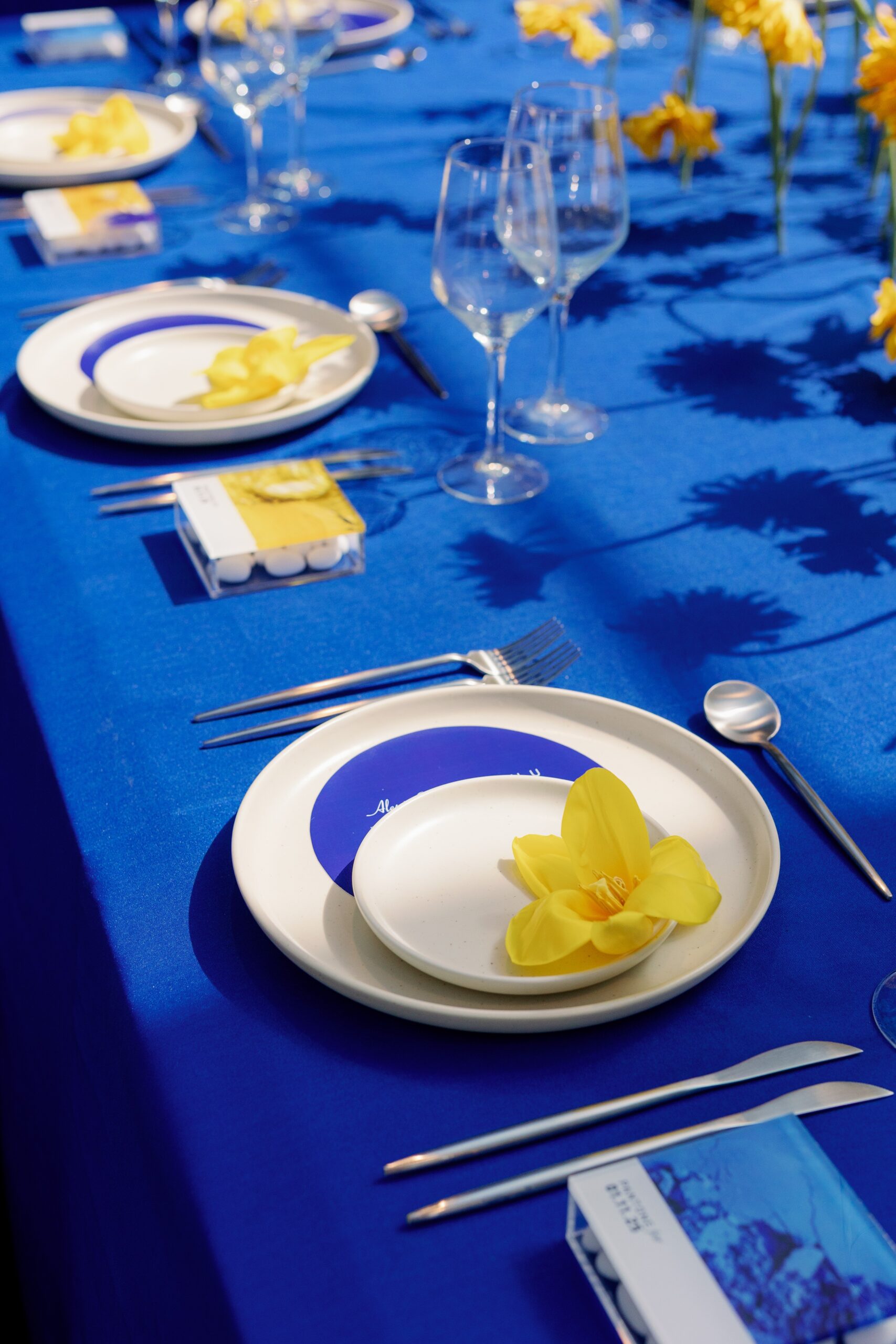 Η ομάδα του THAMA δίνει ιδιαίτερη προσοχή και στο tableware με πιάτα, ποτήρια και μαχαιροπίρουνα που συμπληρώνουν το concept χωρίς να το υπερφορτώνουν. Το μπλε και το κίτρινο εμφανίζονται σε επιλεγμένα στοιχεία, δημιουργώντας απόλυτη συνοχή και ισορροπία.