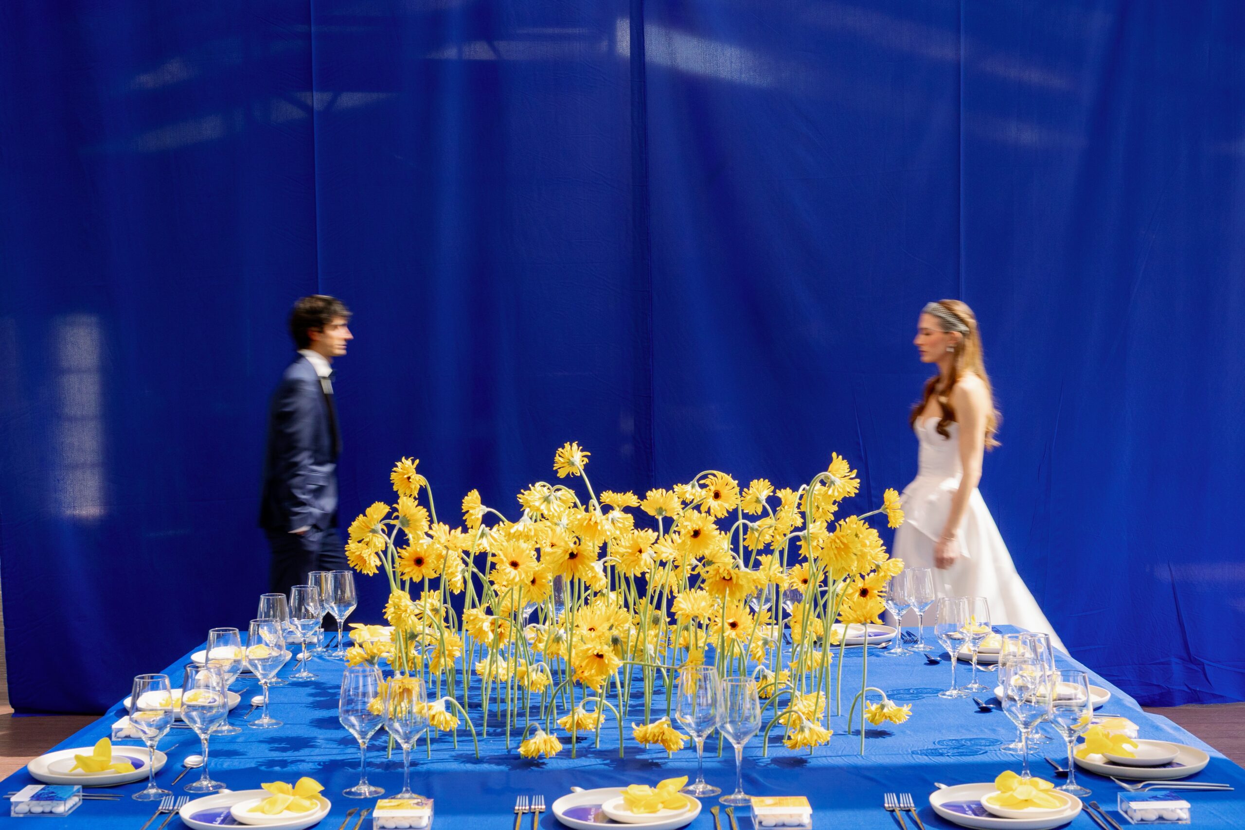 Οι minimal γραμμές συναντούν τα έντονα χρώματα και τη μοντέρνα αισθητική, σε μια δυναμική συνύπαρξη του electric blue και του vibrant yellow, όπου το σύγχρονο design έχει τον πρώτο λόγο. Το concept με την υπογραφή του THAMA ξεδιπλώνεται ως μια ενιαία διαδρομή από το ceremony έως το dinner, με τον σχεδιασμό να γίνεται ο βασικός αφηγητής. Sculptural installations εμπνευσμένα από οργανικές φόρμες επαναπροσδιορίζουν τον χώρο της τελετής, ενώ διάφανα υφάσματα δημιουργούν ένα παιχνίδι φωτός και κίνησης. Κάθε στοιχείο συνδιαλέγεται με το επόμενο, σε μια σύνθεση όπου το χρώμα, η υφή και η φόρμα βρίσκονται σε απόλυτη ισορροπία.