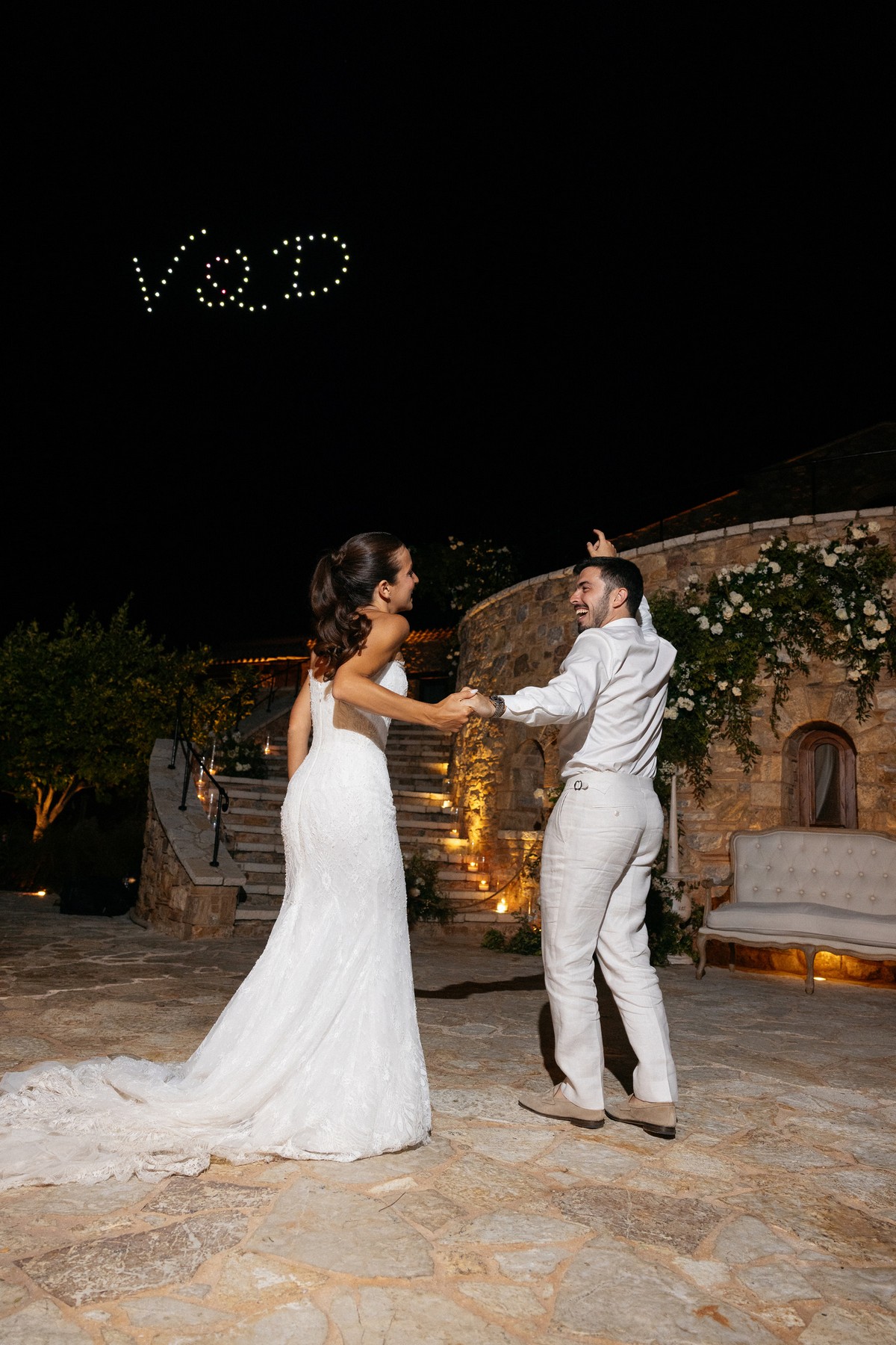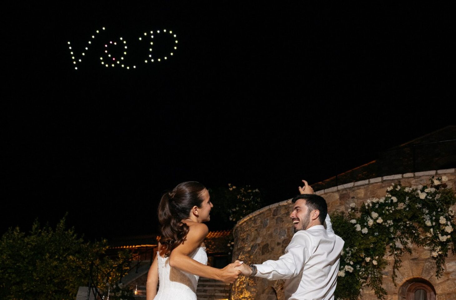 Όπως μοιράστηκε μαζί μας το ζευγάρι: «Η συνεργασία με την ομάδα της DRNS ήταν τόσο ευχάριστη, μας βοήθησε να επιλέξουμε τις τέλειες κινούμενες εικόνες και έκανε τα πάντα για να τις συγχρονίσει με τη μουσική. Δεν μπορούμε να περιγράψουμε πόσο συγκινηθήκαμε βλέποντας την ιστορία μας στον ουρανό. Ήταν το αποκορύφωμα της βραδιάς!».