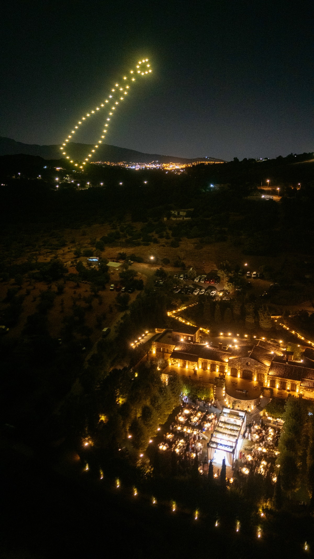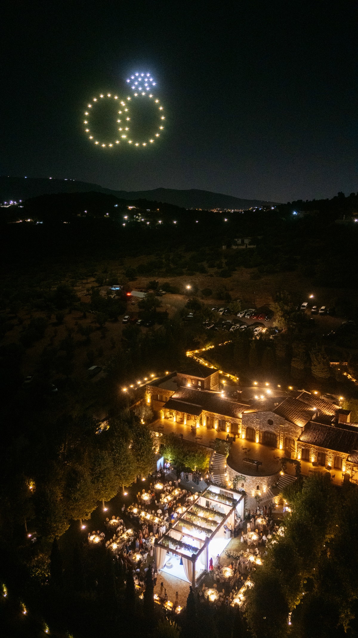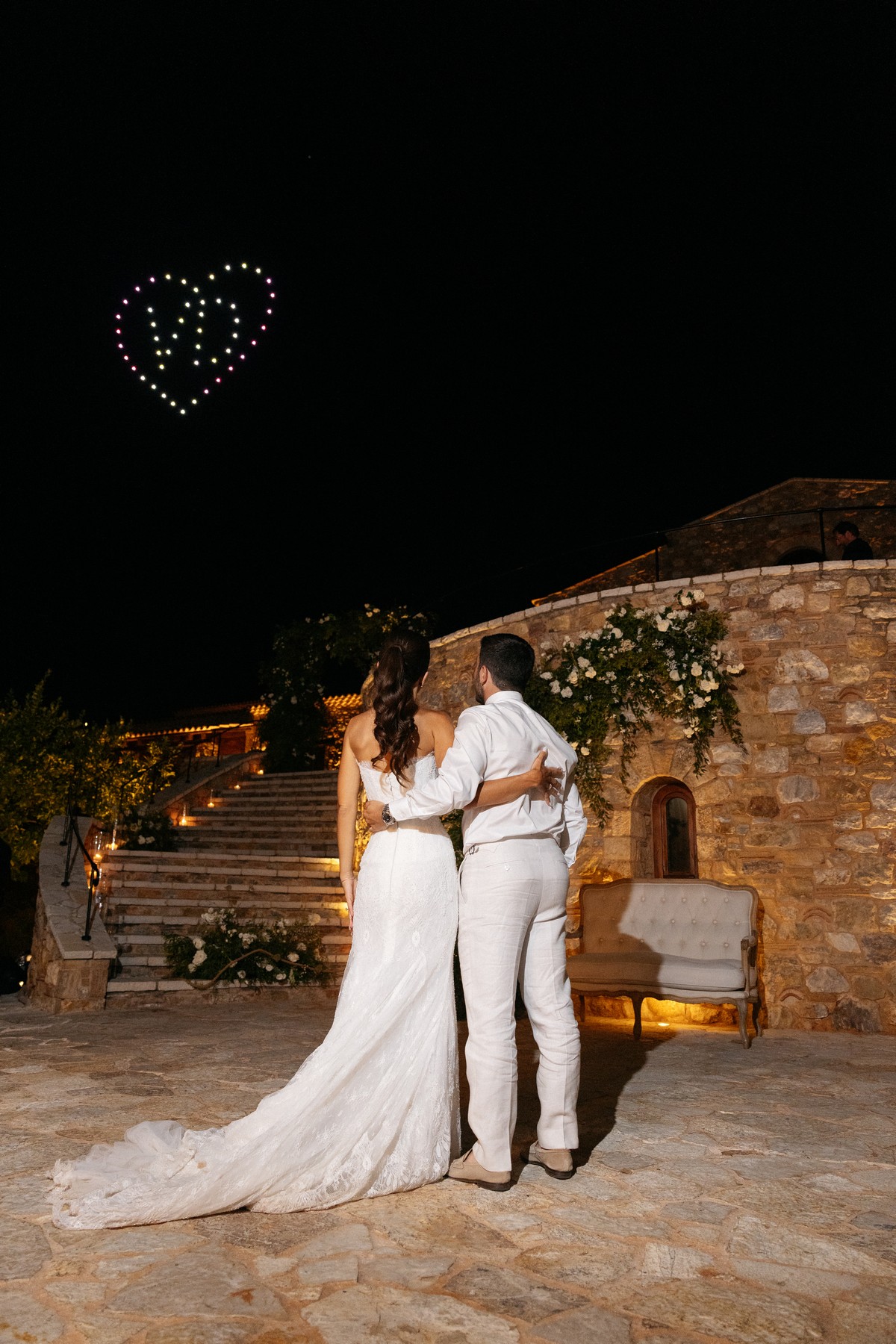 Εκατοντάδες drones φώτισαν τον ουρανό σχηματίζοντας τα αρχικά των ονομάτων του ζευγαριού, καρδιές και άλλα σύμβολα αγάπης που ζωντάνεψαν μπροστά στα μάτια όλων, σε μια ατμόσφαιρα σχεδόν κινηματογραφική. Τα στραμμένα στον ουρανό βλέμματα, τα χαμόγελα, τα αυθόρμητα χειροκροτήματα και τα επιφωνήματα θαυμασμού επιβεβαίωσαν πως αυτή η νέα, πρωτοποριακή μορφή τέχνης ήρθε για να αλλάξει τα δεδομένα στη βιομηχανία του γάμου.