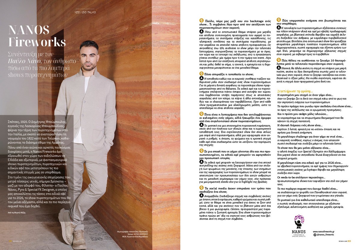 Στο τιμόνι της οικογενειακής επιχείρησης που μετρά τέσσερις γενιές, σήμερα βρίσκεται –μαζί με τον αδερφό του, Φίλιππο– ο Παύλος Νάνος, Pyro & Special FX Designer, ο οποίος μας αποκαλύπτει τις τάσεις στα ειδικά εφέ για το 2026, το show πυροτεχνημάτων που θα του μείνει αξέχαστο, αλλά και το πιο περίεργο request που έχει δεχθεί.