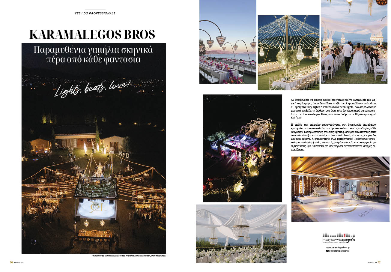 Αν ονειρεύεστε να κάνετε είσοδο στο venue και να αντικρίζετε μία μαγική ατμόσφαιρα, όπου δεσπόζουν επιβλητικοί κρυστάλλινοι πολυέλαιοι, αμέτρητα fairy lights ή εντυπωσιακά neon lights, ενώ παράλληλα η μουσική ανεβάζει τη διάθεση στα ύψη, τότε δεν έχετε παρά να εμπιστευθείτε την Karamalegos Bros, που κάνει θαύματα σε θέματα φωτισμού και ήχου.
