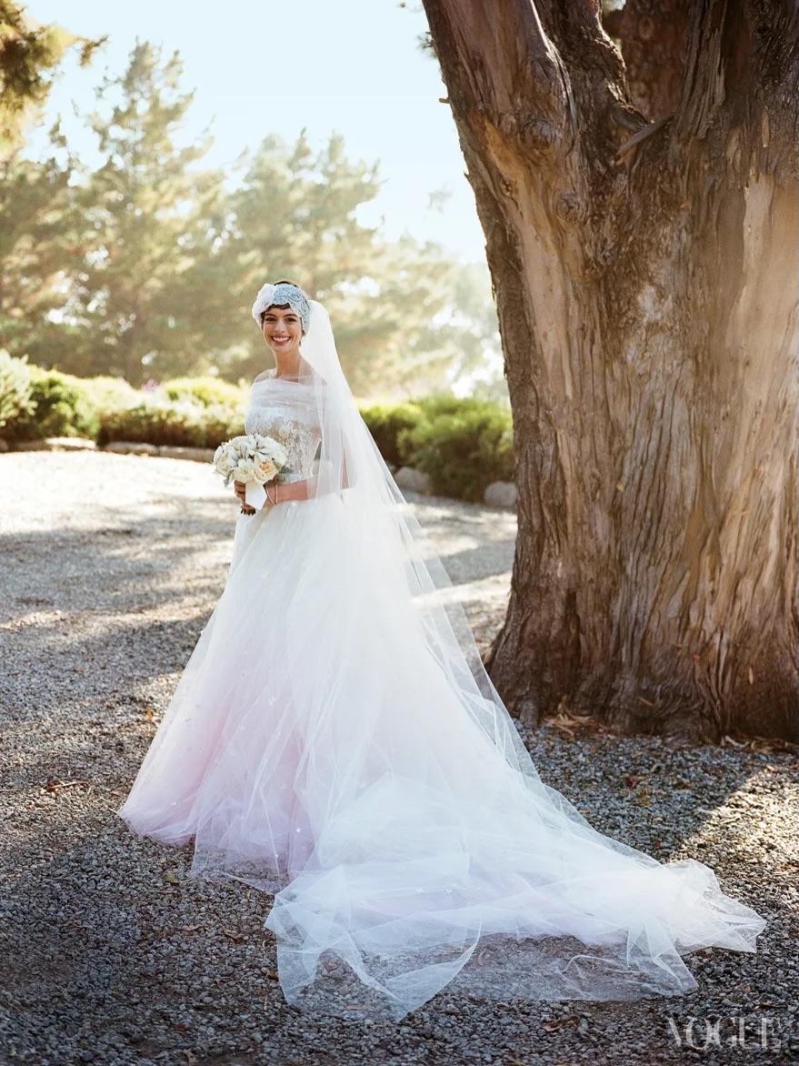 Το επίκεντρο του ενδιαφέροντος ήταν το νυφικό της, μια custom δημιουργία του στενού της φίλου Valentino Garavani. Η Hathaway εμπιστεύτηκε τον εμβληματικό σχεδιαστή για ένα φόρεμα που έγραψε ιστορία: μια ονειρική τουαλέτα από μεταξωτό τούλι, με ακάλυπτους ώμους και περίτεχνα κεντήματα από δαντέλα.