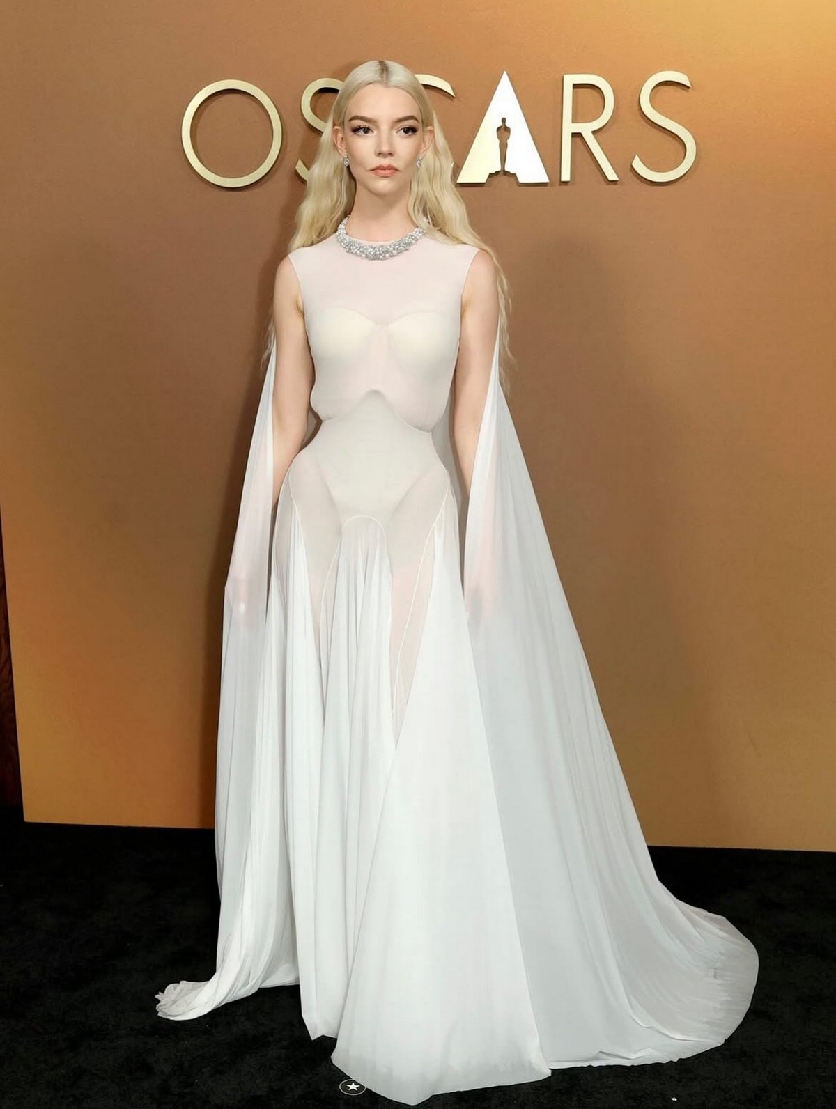 #3 Η Anya Taylor-Joy περπάτησε στο κόκκινο χαλί των Governors Awards 2025 με λευκό φόρεμα από τη συλλογή FW25 Couture του οίκου Maison Margiela. Το gown περιλάμβανε κορσέ, loose πλισέ φούστα και κομψή κάπα. Η ηθοποιός αναβάθμισε το αιθέριο outfit με chunky περιδέραιο Tiffany & Co. με μαργαριτάρια και διαμάντια, χαλαρούς κυματισμούς στα μαλλιά, έντονο μακιγιάζ στα μάτια και… το πιο «in» μανικιούρ για νύφες σε total white. Αν αυτό δεν είναι το «απόλυτο νυφικό σύνολο» για μία edgy, πέρα από τα συνηθισμένα, εμφάνιση, τότε ποιο είναι;