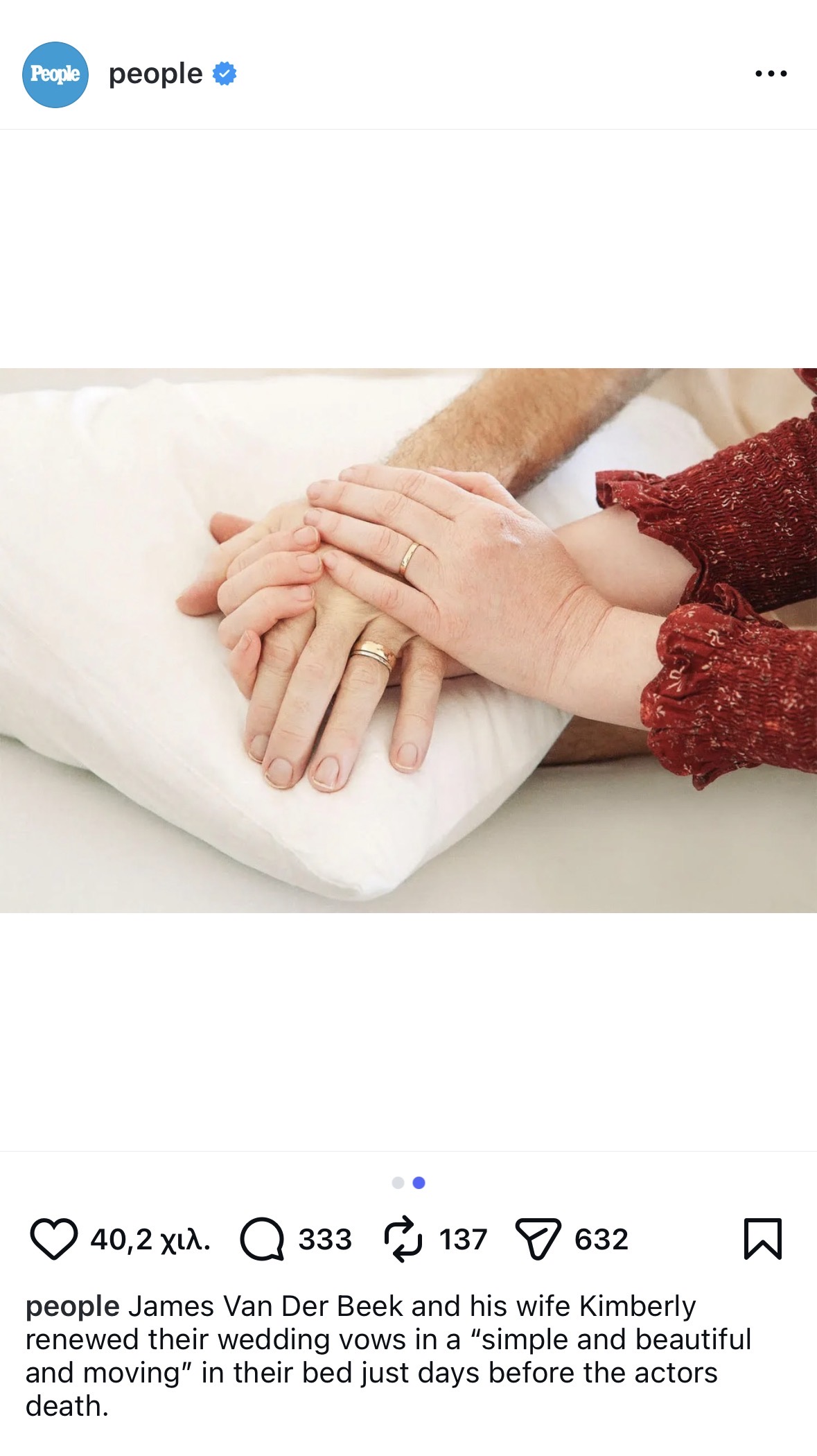 Ο James Van Der Beek και η σύζυγός του Kimberly ανανέωσαν τους γαμήλιους όρκους τους λίγες ημέρες πριν από τον θάνατο του ηθοποιού σε ηλικία 48 ετών. «Το αποφασίσαμε δύο ημέρες νωρίτερα. Οι φίλοι μας αγόρασαν νέα δαχτυλίδια, γέμισαν την κρεβατοκάμαρά μας με λουλούδια και κεριά και ανανεώσαμε τους όρκους μας στο κρεβάτι», ανέφερε η Kimberly στο περιοδικό People, προσθέτοντας ότι η τελετή ήταν «απλή, όμορφη και συγκινητική».