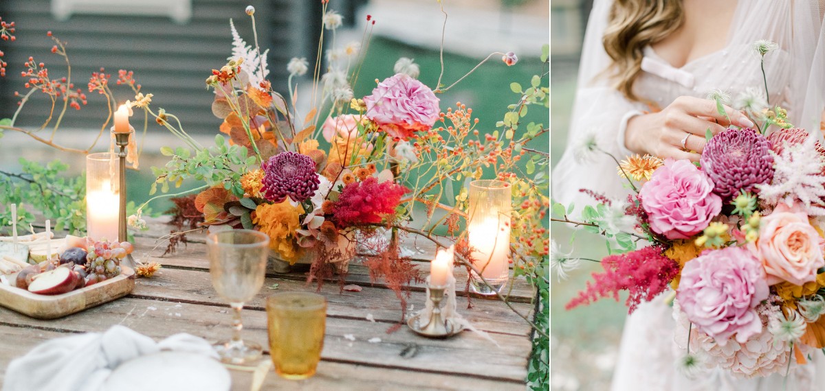 Καρποί του φθινοπώρου, φυλλωσιές από θάμνους, αγριοκερασιές, τριαντάφυλλα και άγριες πρασινάδες συνδυάστηκαν αρμονικά στα centerpieces, το bridal bouquet και την επιβλητική αψίδα που δημιούργησε ο ταλαντούχος συνεργάτης του Yes I Do.