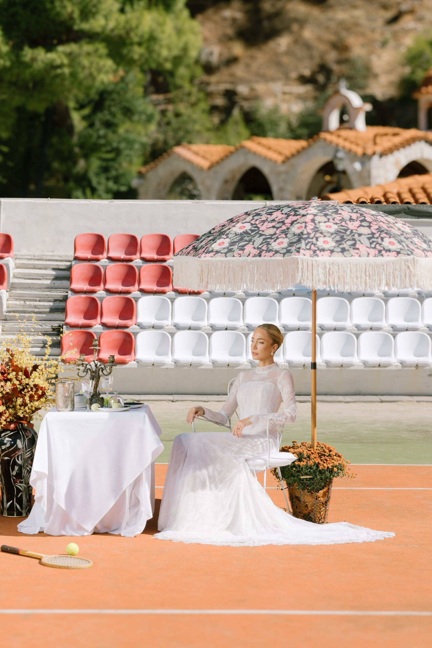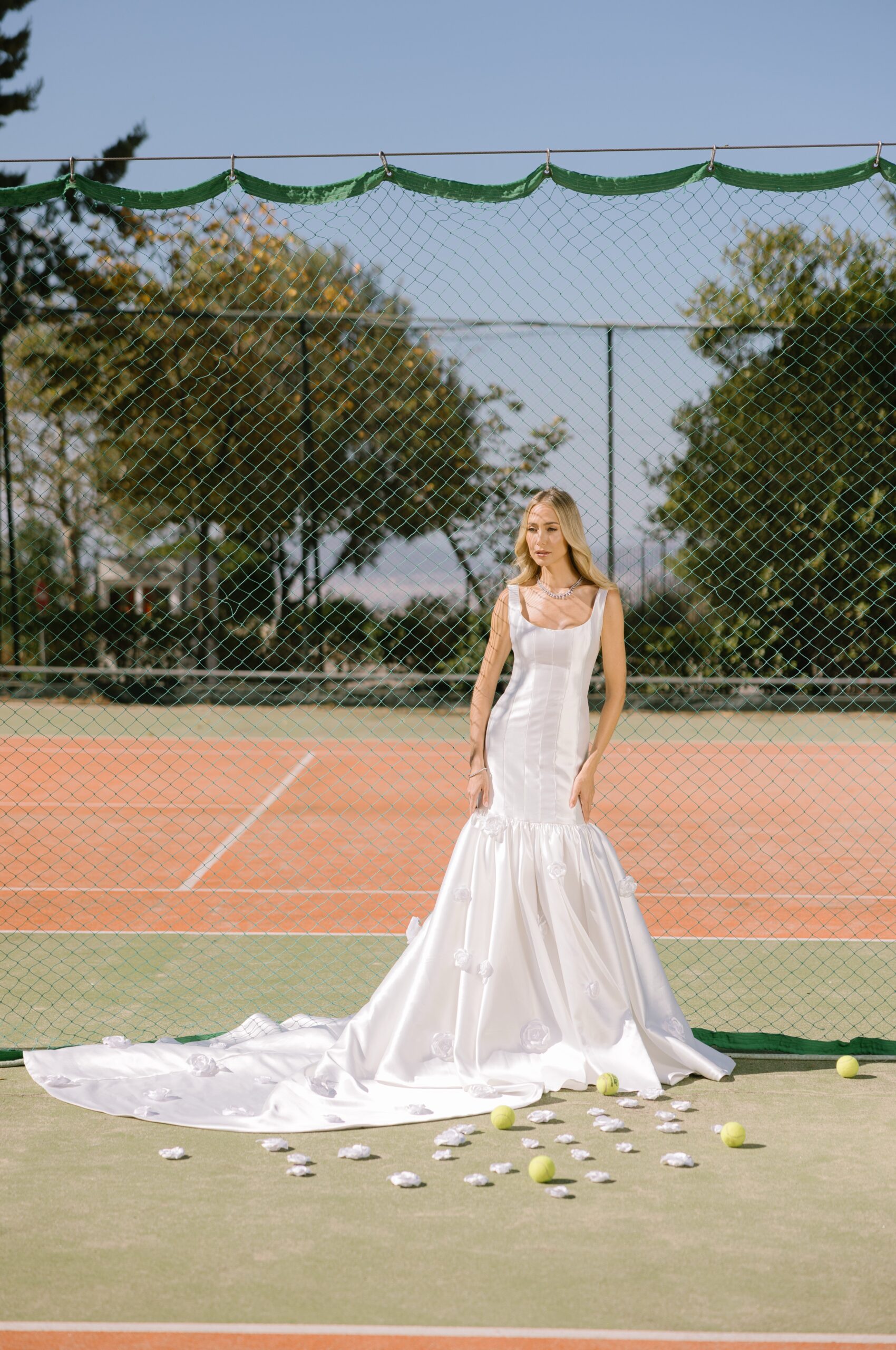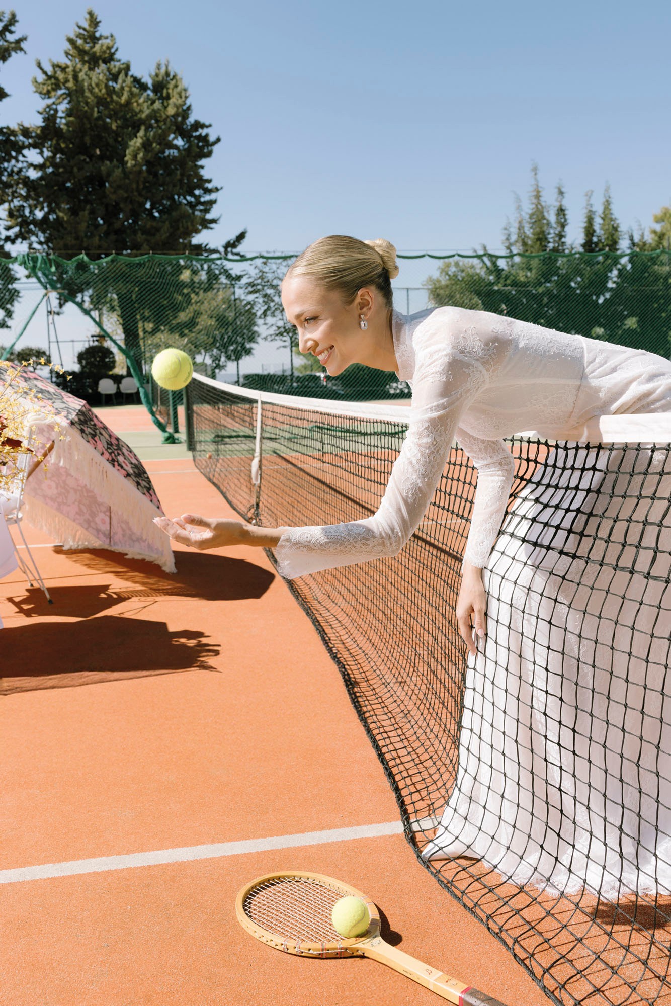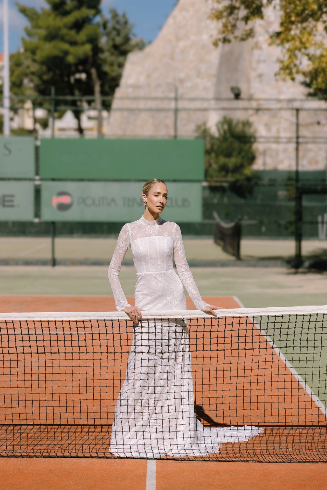 Κάτω από το ευεργετικό φθινοπωρινό φως και με φόντο ένα γήπεδο τένις, η Κατερίνα Ευαγγελινού αποτίει φόρο τιμής στη νύφη τού σήμερα. Δυναμική, φωτεινή και αβίαστα κομψή. Ισορροπώντας ανάμεσα στις ονειρεμένες γαλλικές δαντέλες, τα haute couture νυφικά της Georgia Sini, αλλά και τις αυστηρές γραμμές του τερέν, μας υπενθυμίζει πως ο γάμος είναι ένα… παιχνίδι για δυνατούς παίκτες, με αντοχή, αυτοπεποίθηση και διάθεση για άνευ όρων αφοσίωση.