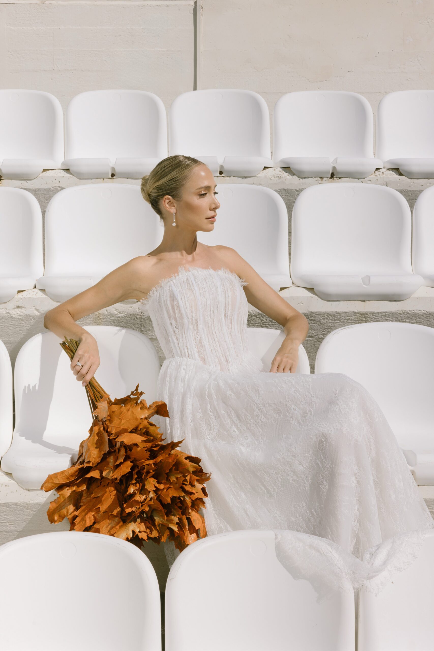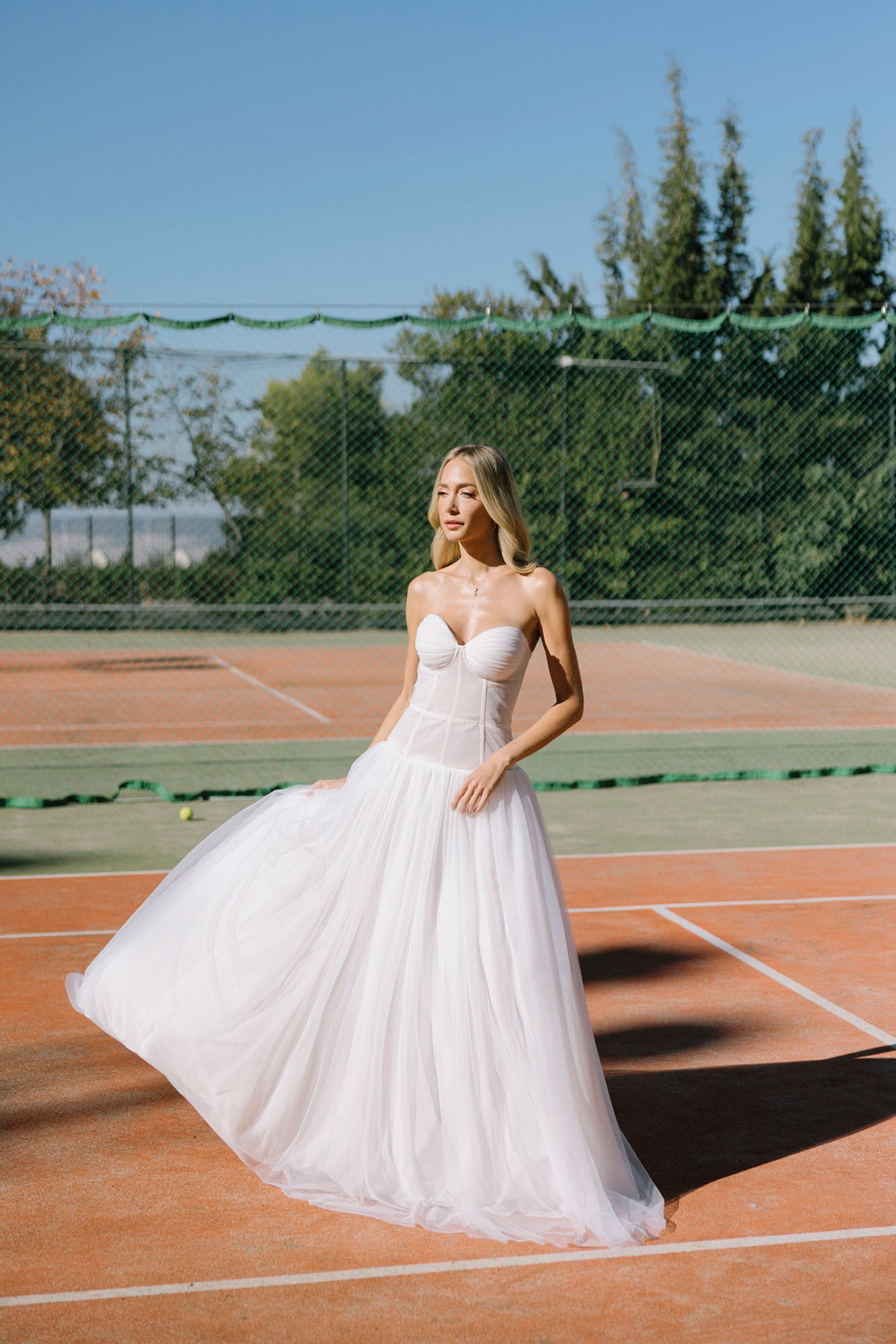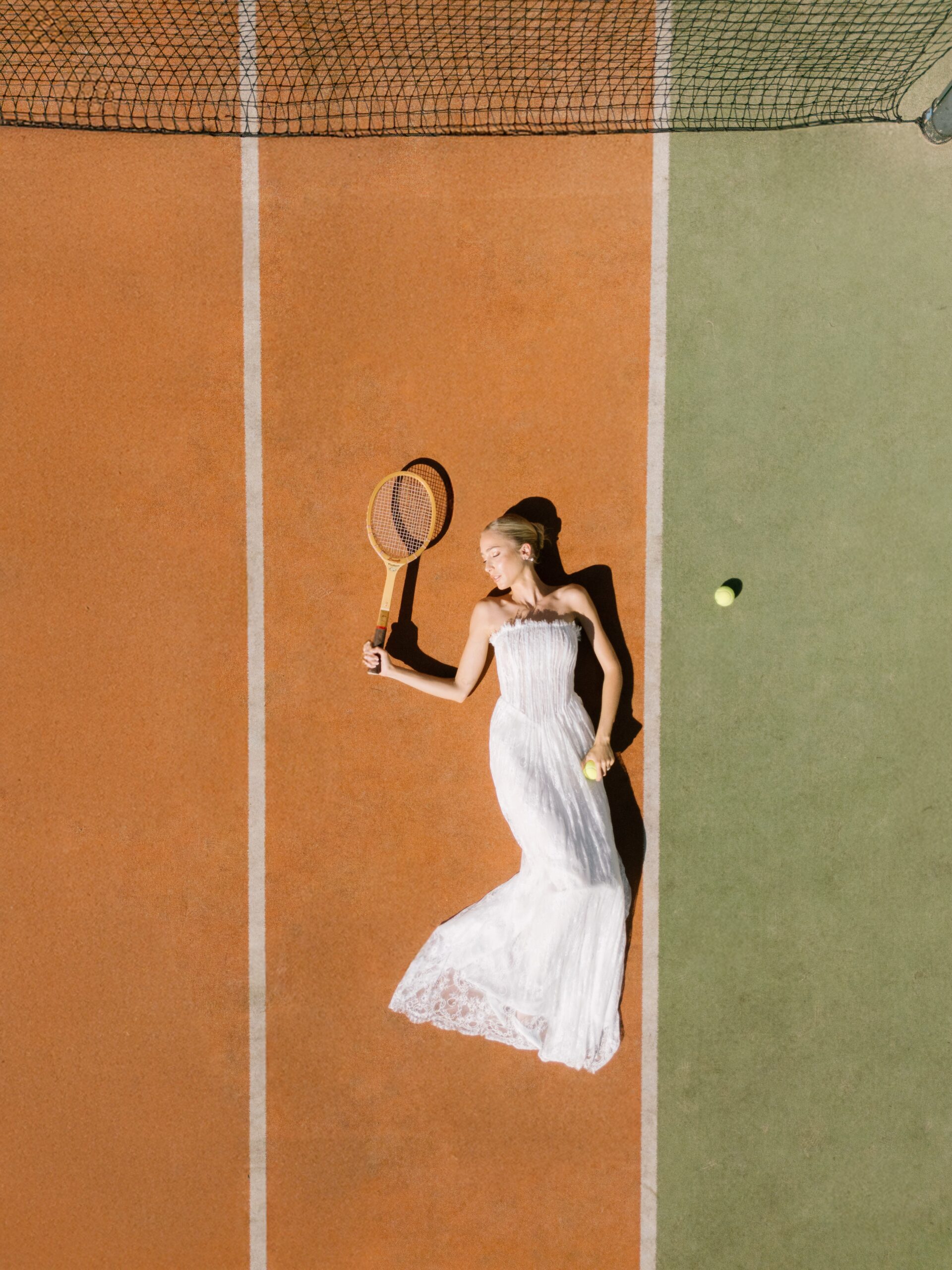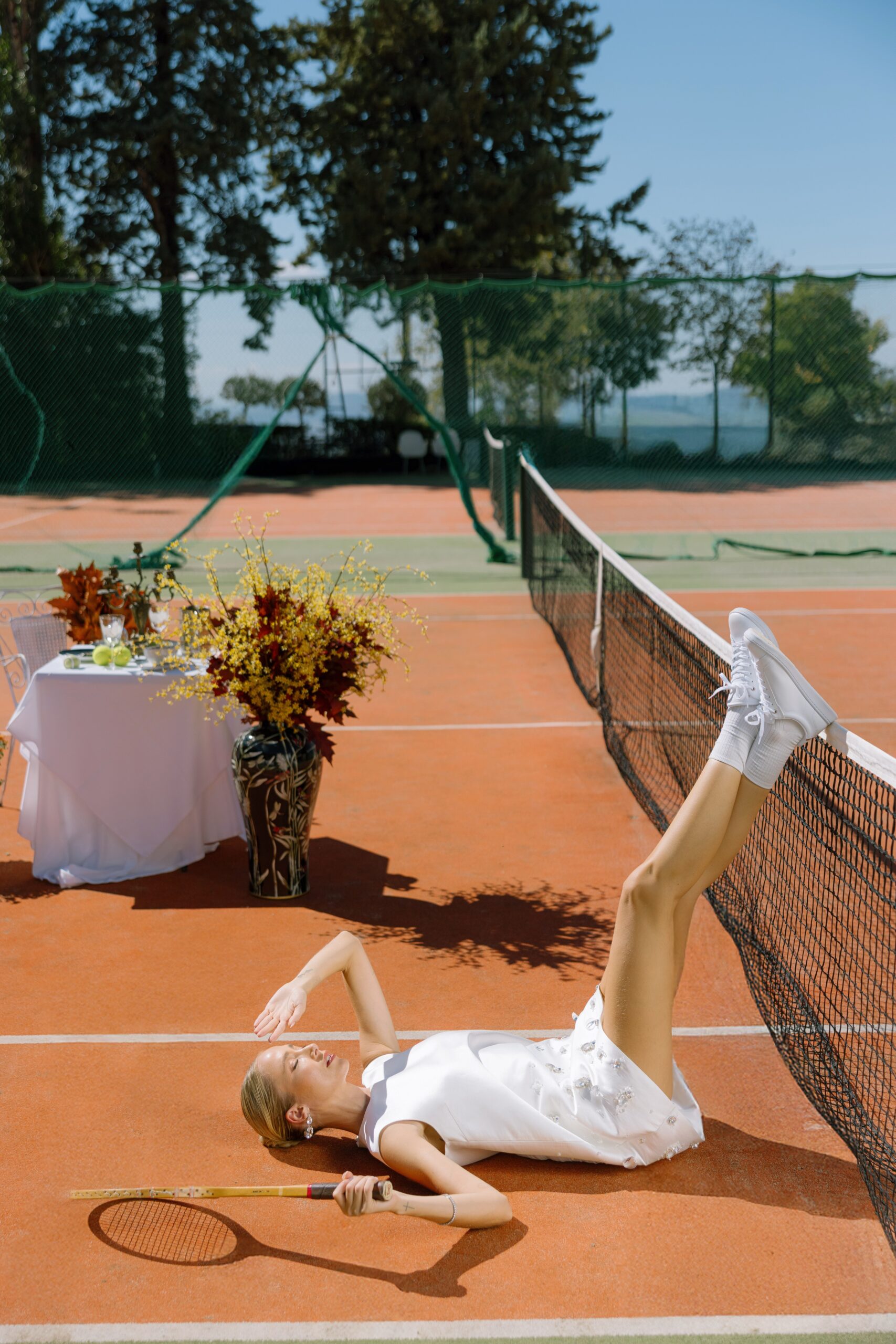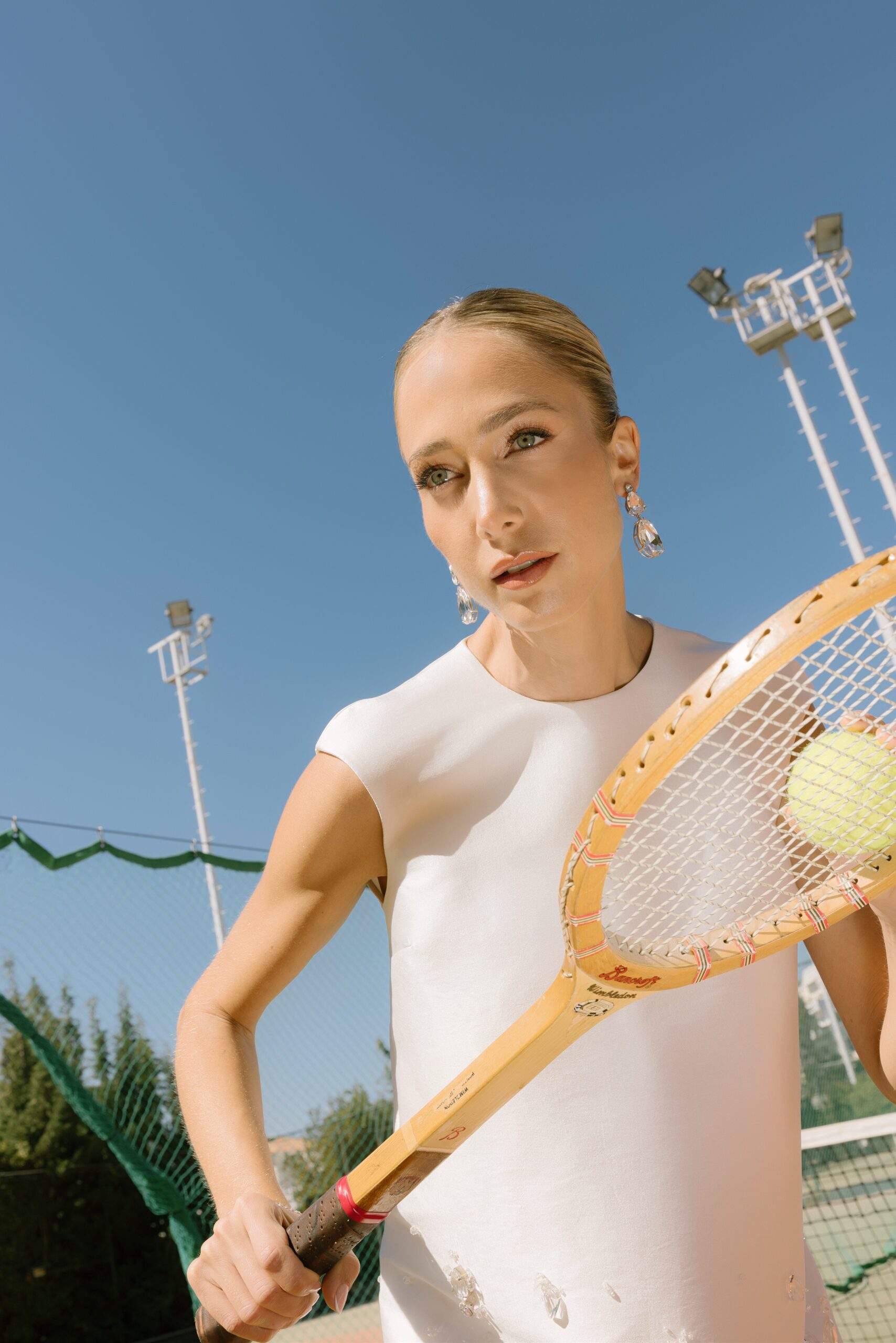 Κάτω από το ευεργετικό φθινοπωρινό φως και με φόντο ένα γήπεδο τένις, η Κατερίνα Ευαγγελινού αποτίει φόρο τιμής στη νύφη τού σήμερα. Δυναμική, φωτεινή και αβίαστα κομψή. Ισορροπώντας ανάμεσα στις ονειρεμένες γαλλικές δαντέλες, τα haute couture νυφικά της Georgia Sini, αλλά και τις αυστηρές γραμμές του τερέν, μας υπενθυμίζει πως ο γάμος είναι ένα… παιχνίδι για δυνατούς παίκτες, με αντοχή, αυτοπεποίθηση και διάθεση για άνευ όρων αφοσίωση.