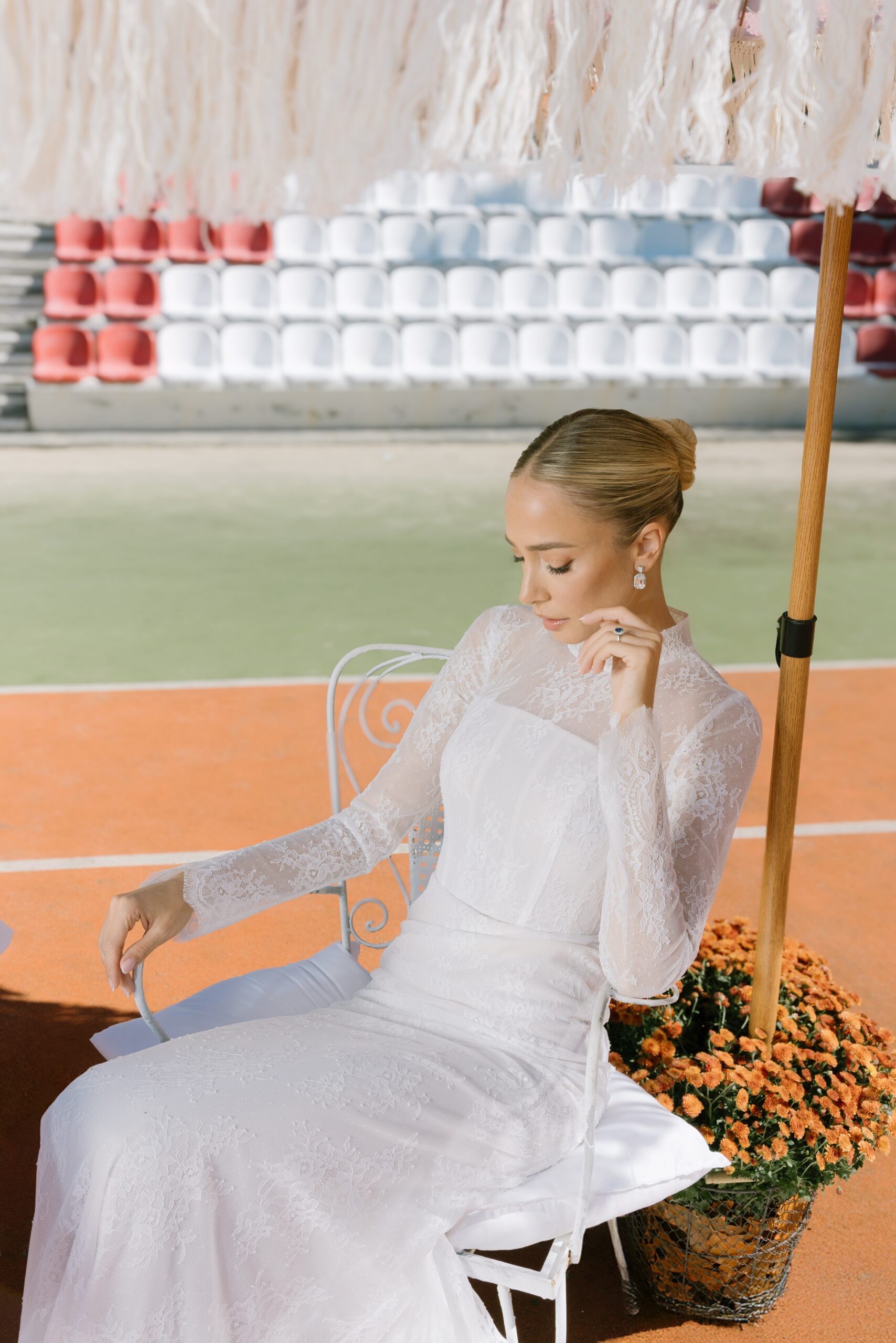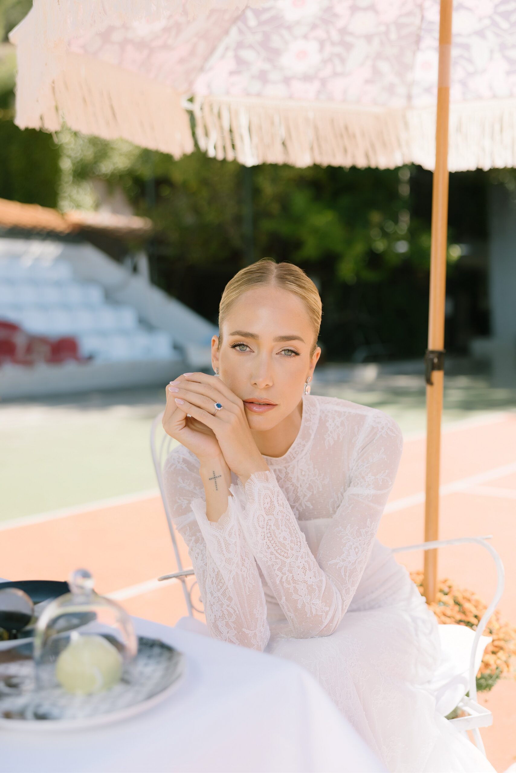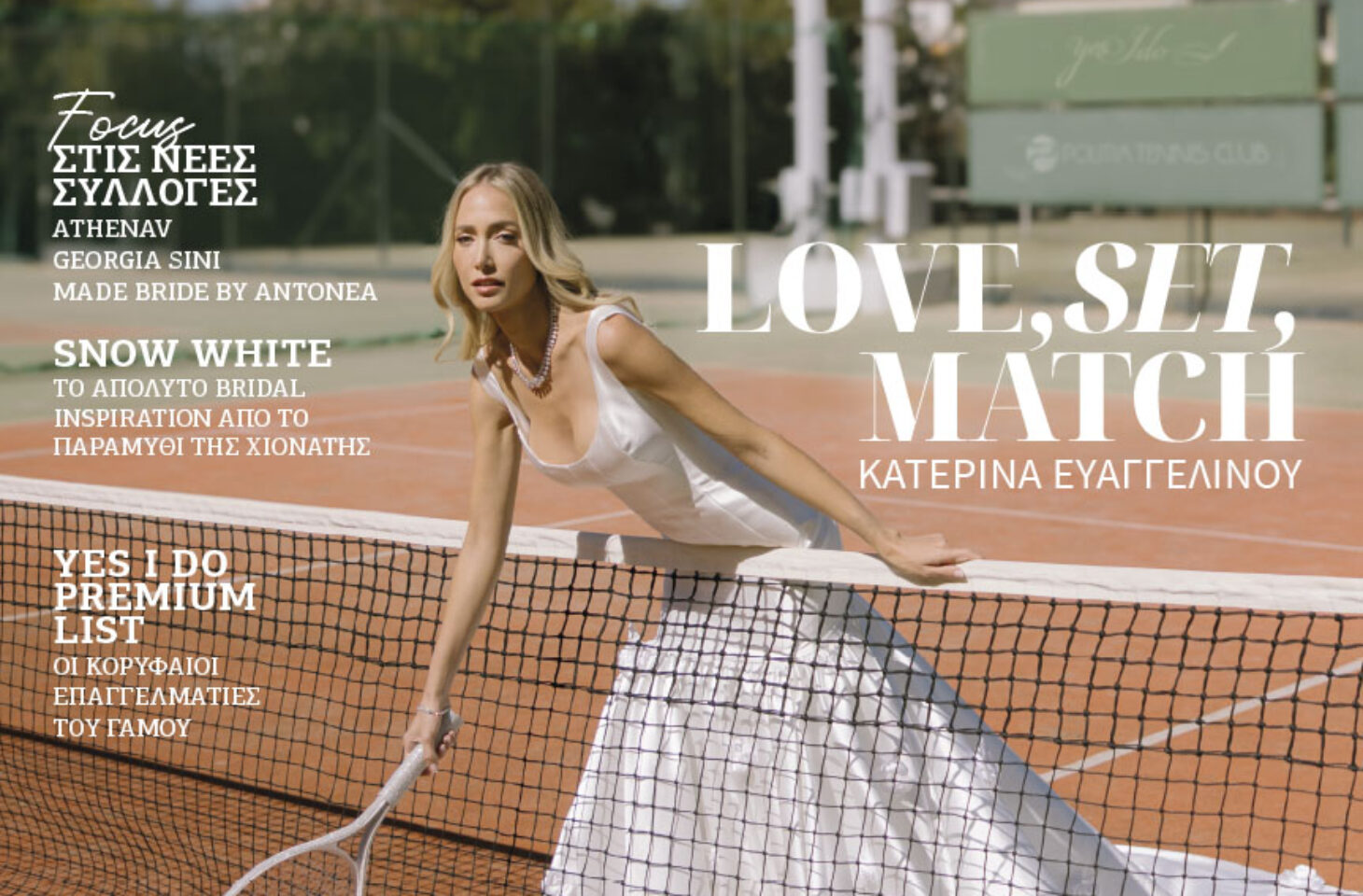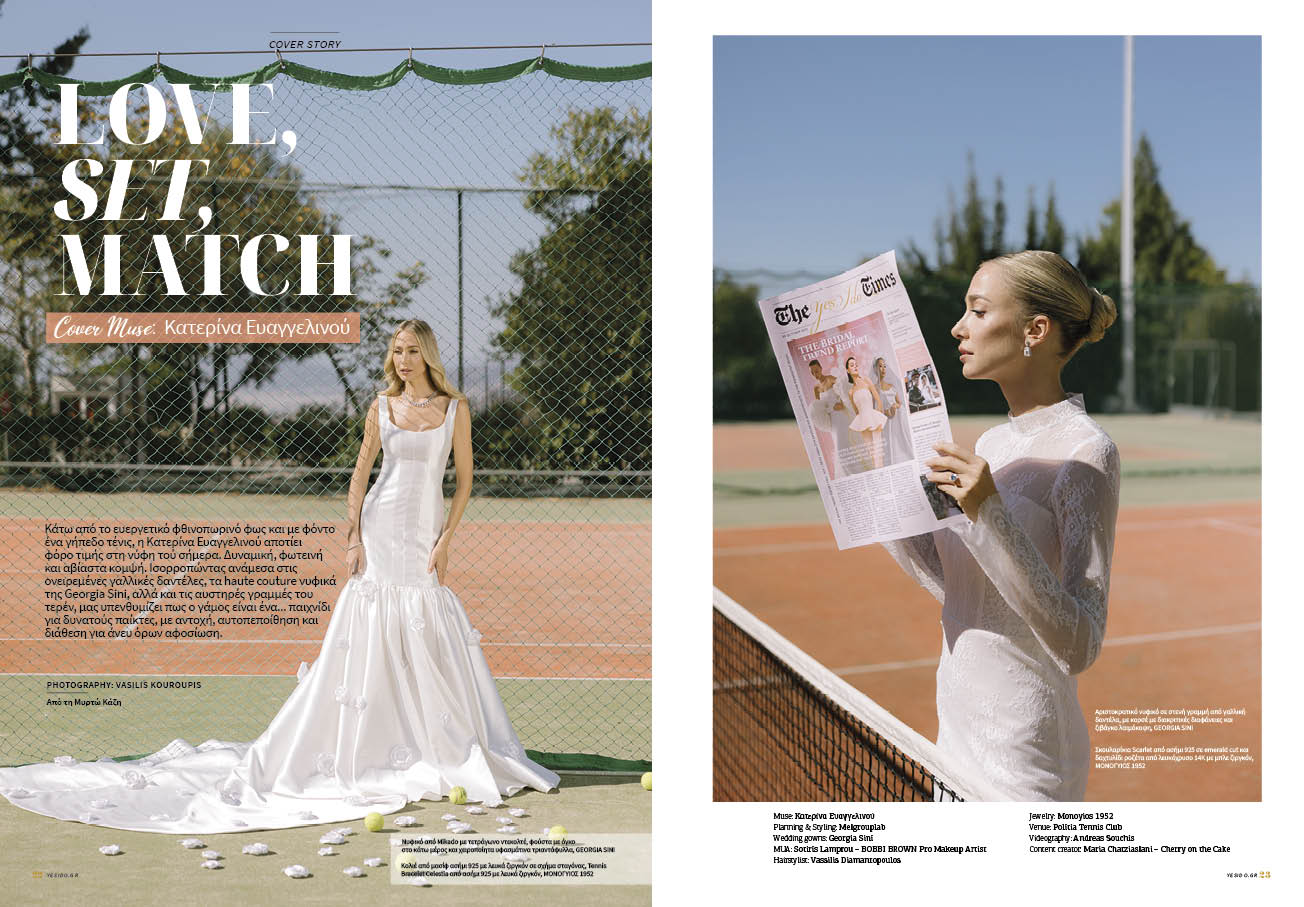 Κάτω από το ευεργετικό φθινοπωρινό φως και με φόντο ένα γήπεδο τένις, η Κατερίνα Ευαγγελινού αποτίει φόρο τιμής στη νύφη τού σήμερα. Δυναμική, φωτεινή και αβίαστα κομψή. Ισορροπώντας ανάμεσα στις ονειρεμένες γαλλικές δαντέλες, τα haute couture νυφικά της Georgia Sini, αλλά και τις αυστηρές γραμμές του τερέν, μας υπενθυμίζει πως ο γάμος είναι ένα… παιχνίδι για δυνατούς παίκτες, με αντοχή, αυτοπεποίθηση και διάθεση για άνευ όρων αφοσίωση.