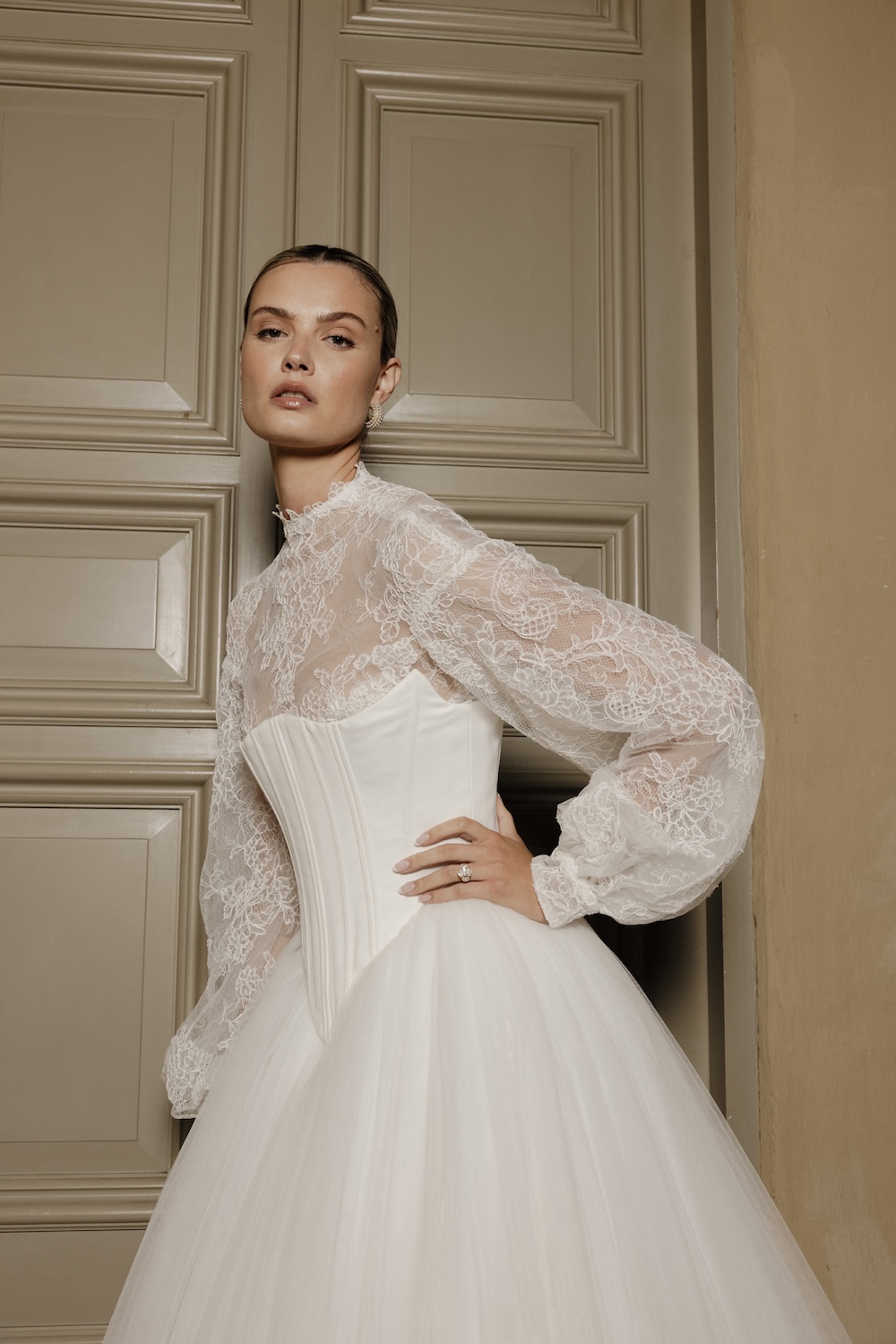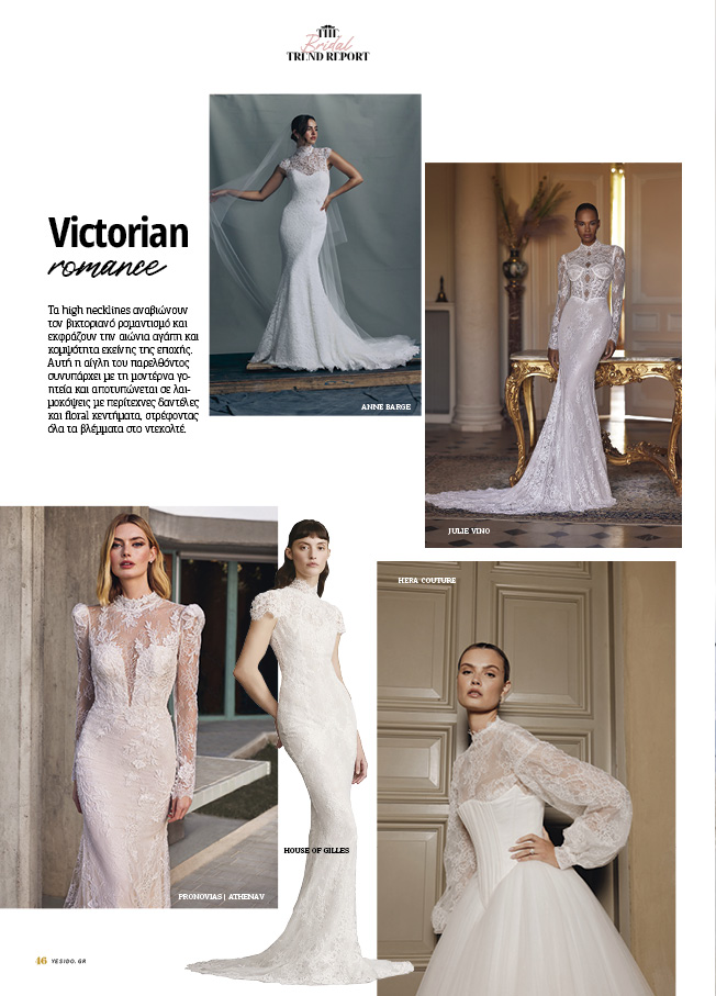 Τα high necklines αναβιώνουν τον βικτοριανό ρομαντισμό και εκφράζουν την αιώνια αγάπη και κομψότητα εκείνης της εποχής. Αυτή η αίγλη του παρελθόντος συνυπάρχει με τη μοντέρνα γοητεία και αποτυπώνεται σε λαιμοκόψεις με περίτεχνες δαντέλες και floral κεντήματα, στρέφοντας όλα τα βλέμματα στο ντεκολτέ.