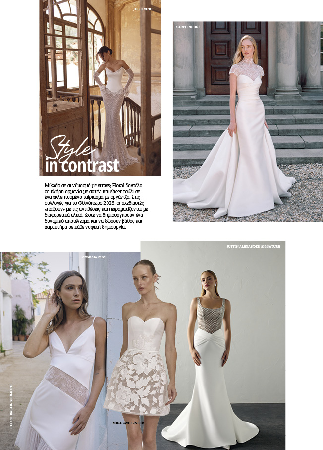 Mikado σε συνδυασμό με strass; Floral δαντέλα σε πλήρη αρμονία με σατέν, και sheer τούλι σε ένα εκλεπτυσμένο ταίριασμα με οργάντζα; Στις συλλογές για το Φθινόπωρο 2026, οι σχεδιαστές «παίζουν» με τις αντιθέσεις και πειραματίζονται με διαφορετικά υλικά, ώστε να δημιουργήσουν ένα δυναμικό αποτέλεσμα και να δώσουν βάθος και χαρακτήρα σε κάθε νυφική δημιουργία.