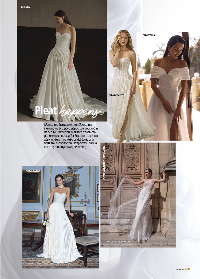 Άλλοτε πιο διακριτικές και άλλοτε πιο έντονες, σε ένα μόνο μέρος του νυφικού ή σε όλο το μήκος του, οι πιέτες αποτελούν μία τεχνική που χαρίζει διάσταση, υφή και αέρινη κίνηση σε κάθε bridal look, ενώ δίνει την αίσθηση του διαχρονικού ακόμα και στις πιο σύγχρονες σιλουέτες.
