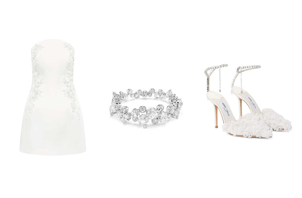 Mini strapless φόρεμα, Rebecca Vallance | Βραχιόλι, από τη συλλογή Constella, με επιμετάλλωση ροδίου, Swarovski | Γόβες με embellishments, Jimmy Choo