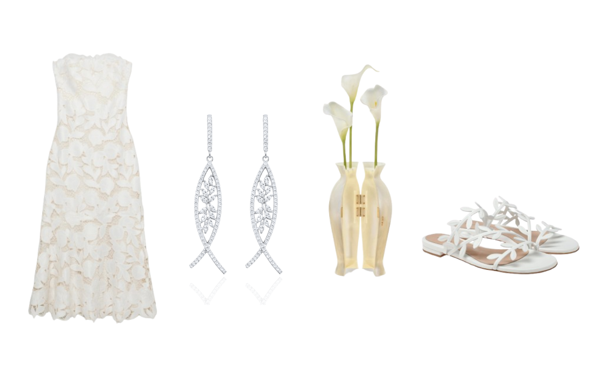 Strapless φόρεμα με κεντήματα, Simkhai | Κρεμαστά σκουλαρίκια από ασήμι 925 με λευκά ζιργκόν, ΜΟΝΟΓΥΙΟΣ 1952 | Clutch bag σε σχήμα βάζου, Cult Gaia | Δερμάτινα flats, Gianvito Rossi