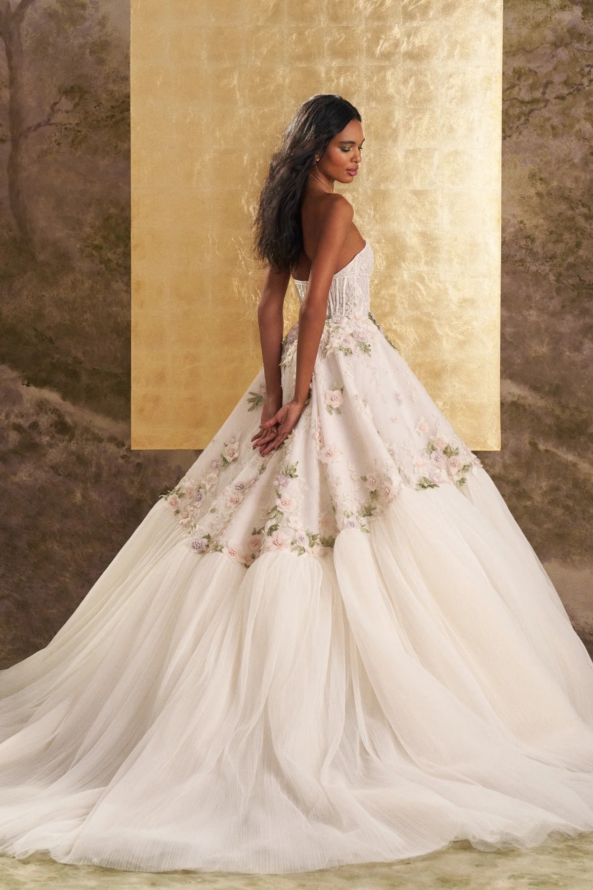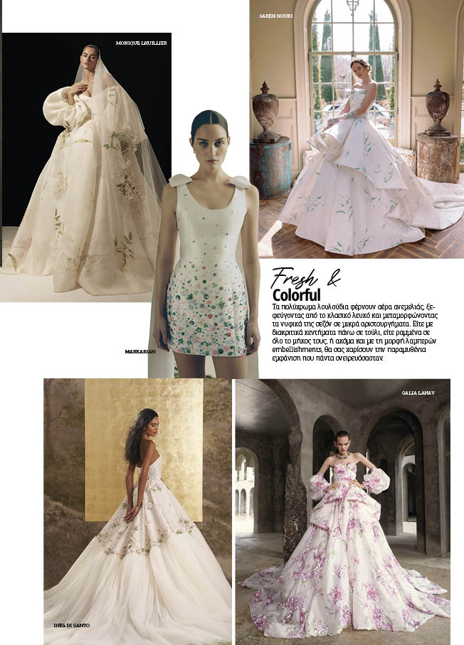 Τα πολύχρωμα λουλούδια φέρνουν αέρα ανεμελιάς, ξεφεύγοντας από το κλασικό λευκό και μεταμορφώνοντας τα νυφικά της σεζόν σε μικρά αριστουργήματα. Είτε με διακριτικά κεντήματα πάνω σε τούλι, είτε ραμμένα σε όλο το μήκος τους, ή ακόμα και με τη μορφή λαμπερών embellishments, θα σας χαρίσουν την παραμυθένια εμφάνιση που πάντα ονειρευόσασταν.