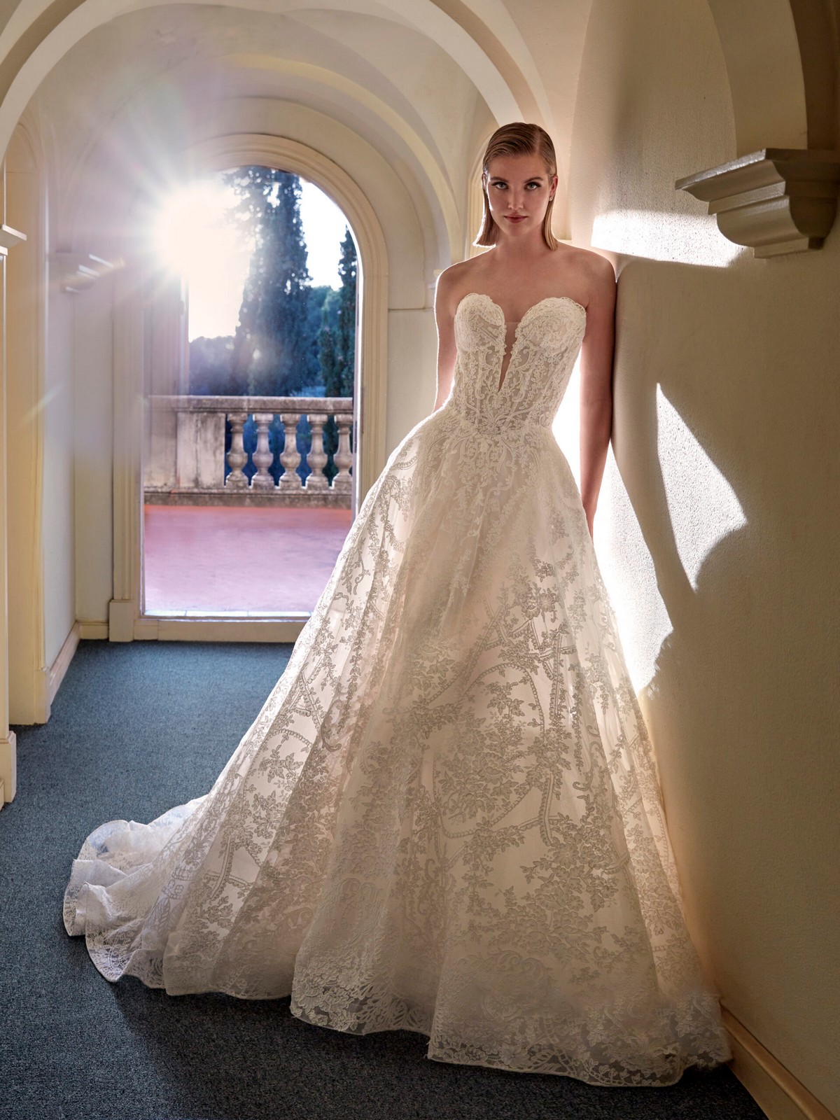 Πριγκιπικό, strapless νυφικό με μπούστο σε σχήμα καρδιάς, από αριστοκρατική δαντέλα που χαρίζει ένα κλασικό και sophisticated bridal look.