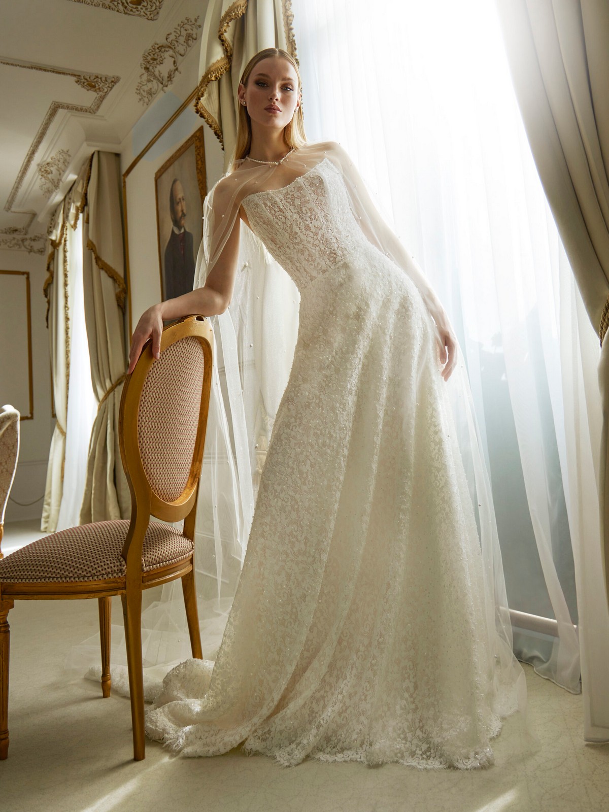 Ρομαντικό νυφικό με strapless λαιμόκοψη σε cat-eye σχήμα, floral κεντήματα από εκλεπτυσμένη δαντέλα και πέρλες. Το bridal look ολοκληρώνεται με μακριά, αιθέρια κάπα διακοσμημένη επίσης με πέρλες.