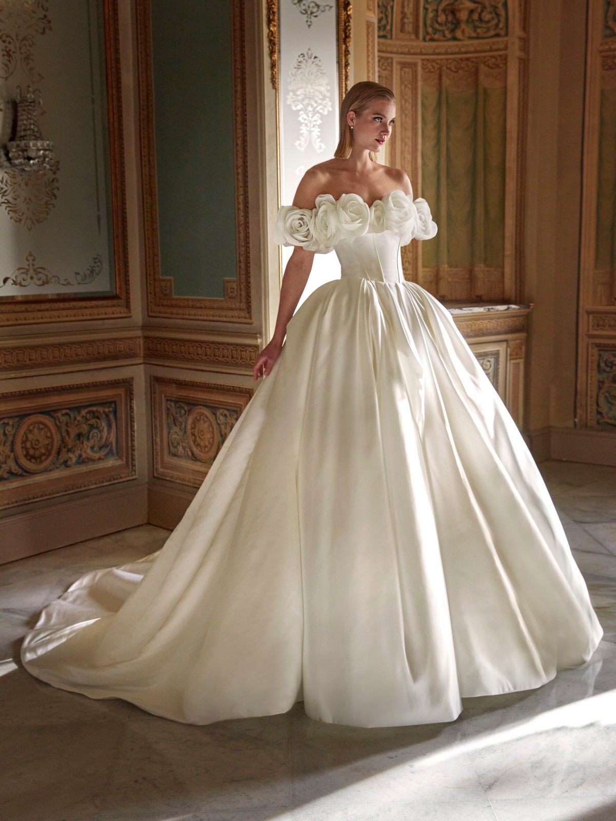 Off-the-shoulder νυφικό από σατέν και οργάντζα, σε princess γραμμή, με 3D λουλούδια στο μπούστο, που εκπέμπει μια πριγκιπική γοητεία. Η ιδανική επιλογή για νύφες που επιθυμούν διαχρονική κομψότητα με ένα σύγχρονο twist.