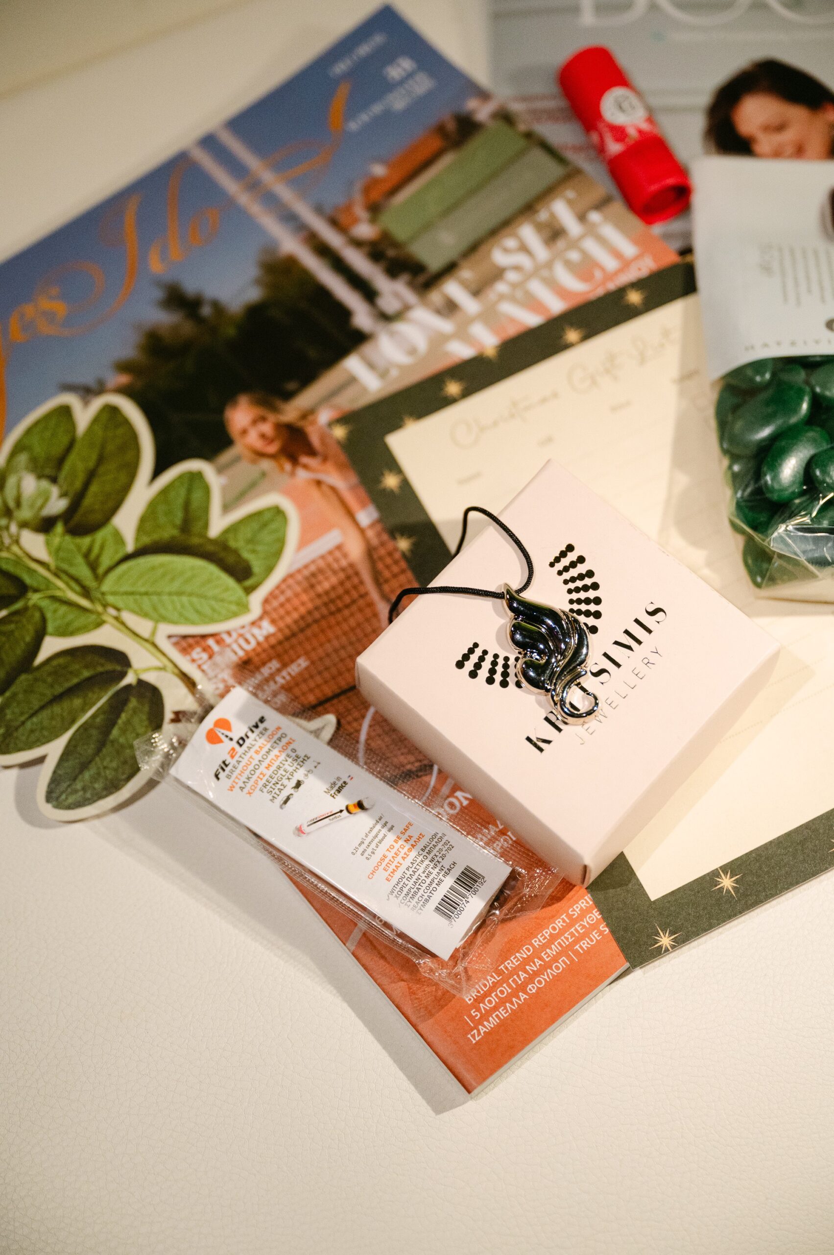 Τι περιείχε λοιπόν φέτος το κομψό, κυπαρρισί, velvet pouch; Τα τελευταία τεύχη των περιοδικών Yes I Do και BOOM, το γούρι του 2026, κουφέτα, προϊόντα ομορφιάς και άλλα It items που οι πολύτιμοι συνεργάτες του Yes I Do θέλησαν να δωρίσουν στους Yes I Do guests.