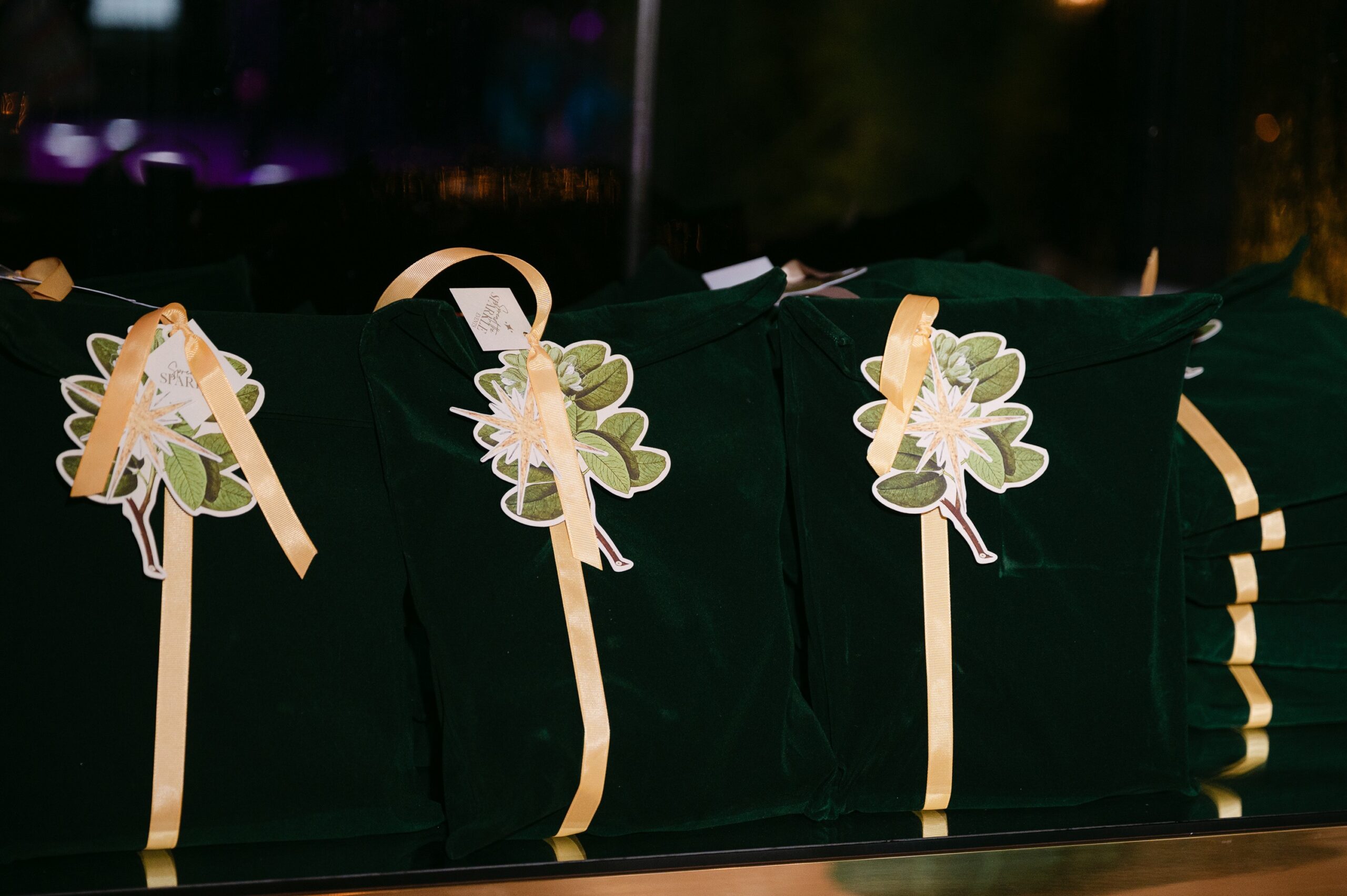 Η Κουφετοποιία Χατζηγιαννάκη επέλεξε τα μεταλλιζέ κουφέτα Bijoux Supreme με σοκολάτα (70% κακάο) με λεπτή επικάλυψη ζάχαρης, σε πράσινο σκούρο και χρυσό σατινέ, ακολουθώντας πιστά το concept του party! Η InterMed χάρισε στους καλεσμένους το αντισηπτικό χεριών Reval Plus με άρωμα καρύδα, ενώ η Roger & Gallet το νέο Beautifying Balm Χειλιών σε 4 αρώματα, Néroli, Rose, Gingembre Rouge και Fleur de Figuier.